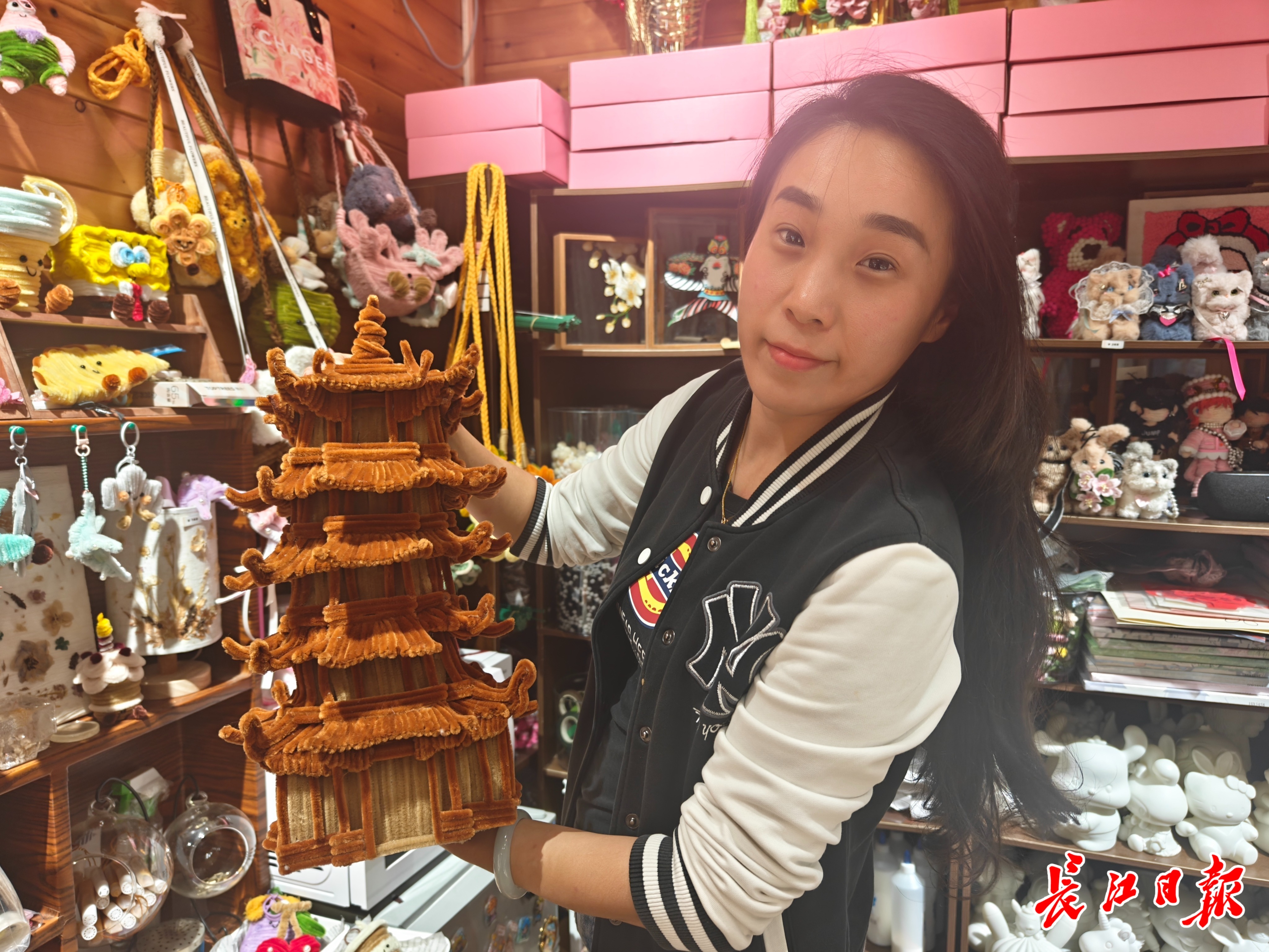 闫佳展示正在设计的黄鹤楼扭扭棒作品
