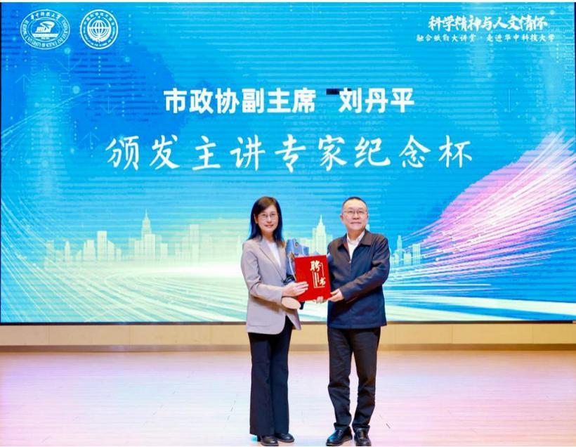 武汉市政协副主席刘丹平为黄峻博士颁发了主讲专家纪念杯和证书