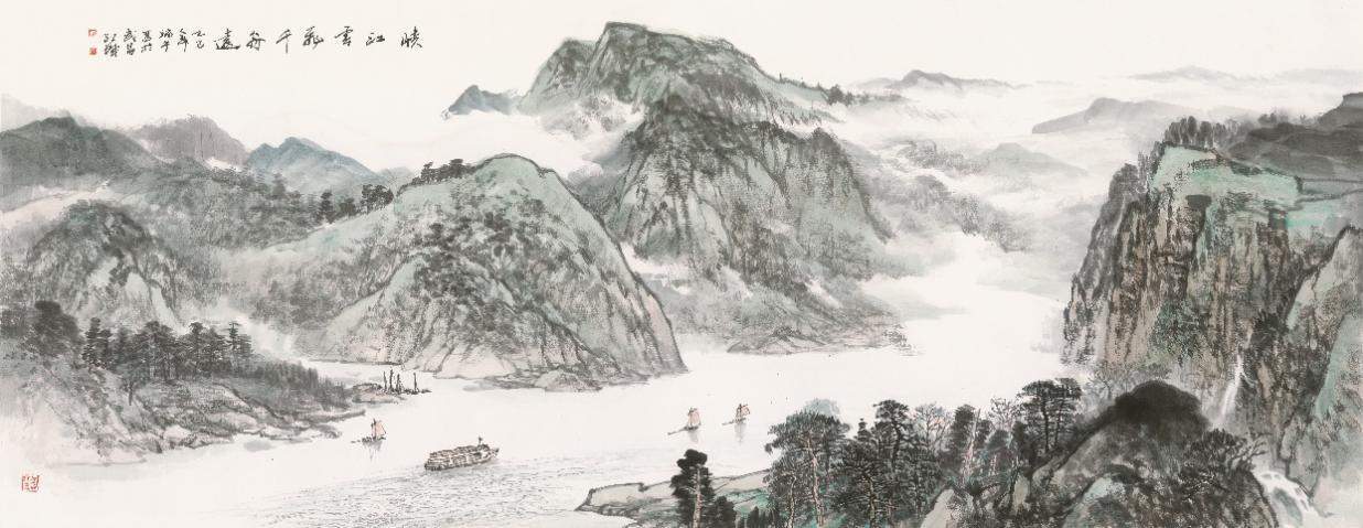 施江城《峡江云飞千舟远》367x144cm 2025年
