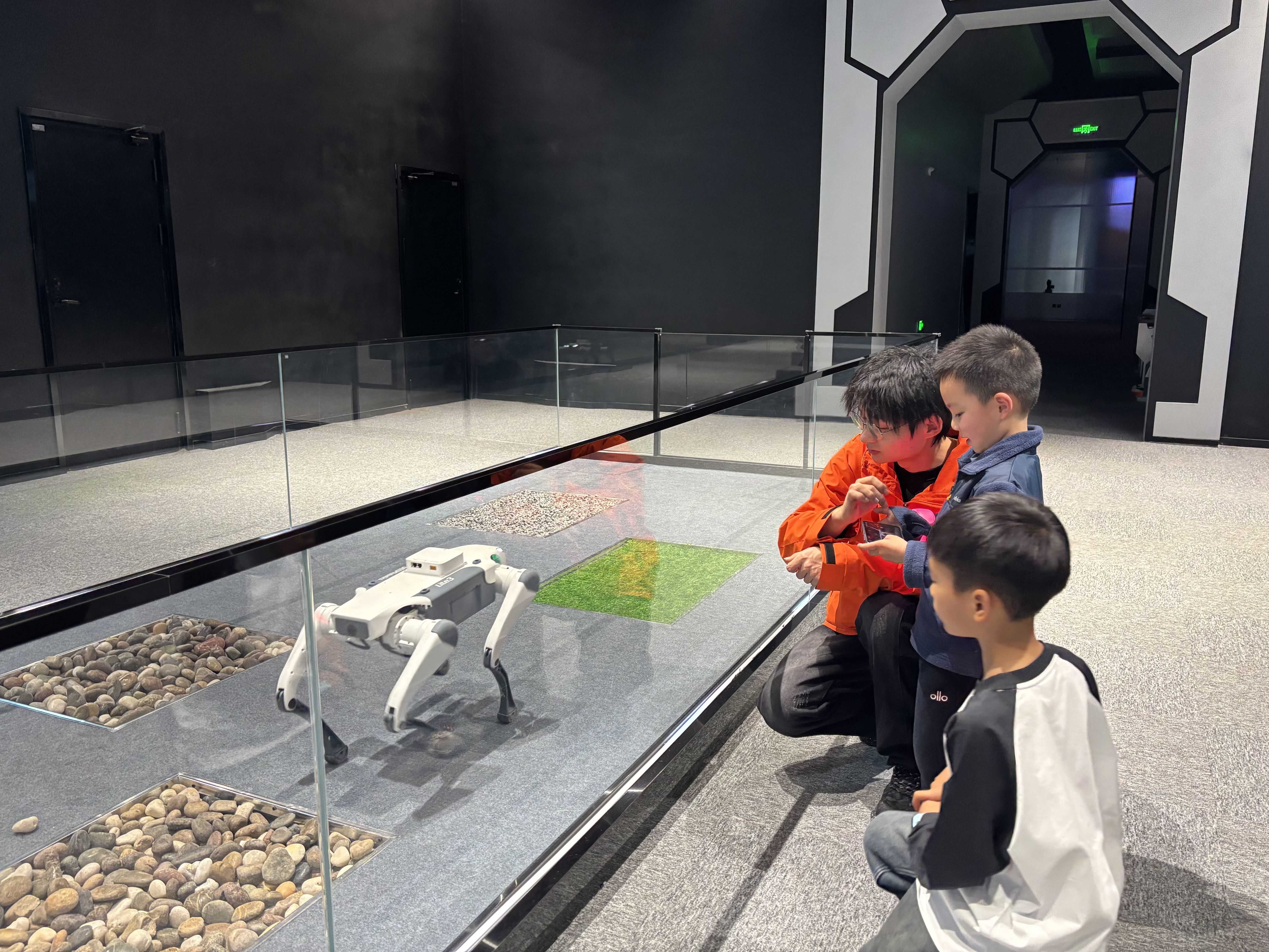 “快看快看,它会后空翻!”在工作人员的指引下,小朋友手持遥控器,指挥面前的机器狗凌空跃起,随即在布满石子的草坪上稳稳落地,几个胆大的孩子凑上前,伸手摸了摸机器狗的脑袋,机器狗摇头晃脑回应着大家的亲昵。