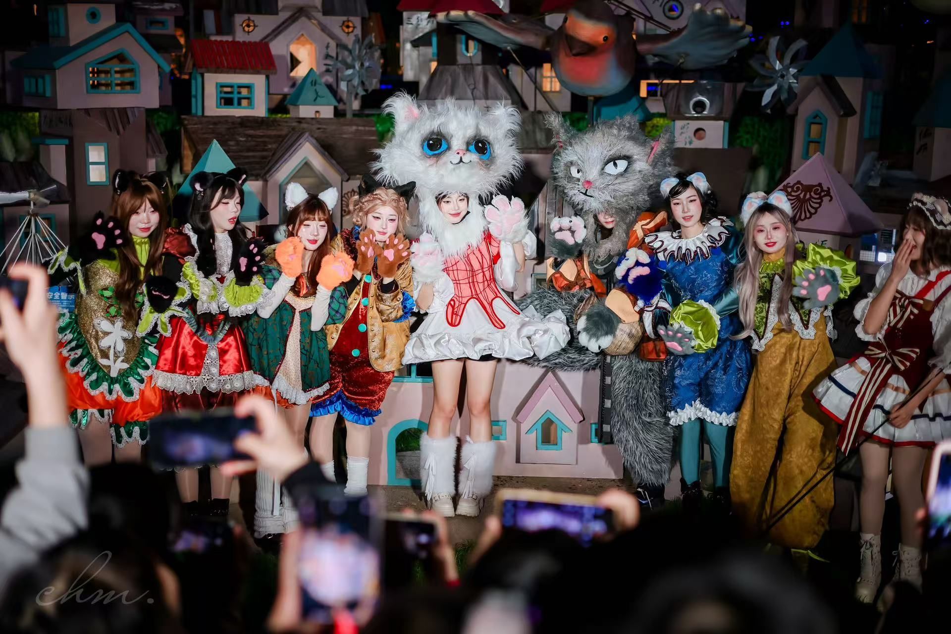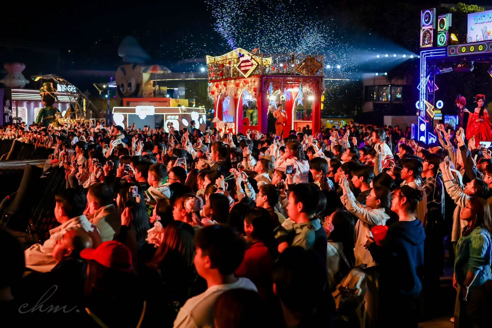 舞者表演至高潮时,璀璨礼花腾空而起,金色、粉色的火花在夜空绽放,与舞台灯光、舞者身影交相辉映,照亮了台下每一位游客的笑脸,不少游客自发拿出手机灯光挥舞,与舞台表演形成呼应,极简的仪式却满是仪式感,将整场嘉年华的氛围推向顶峰。