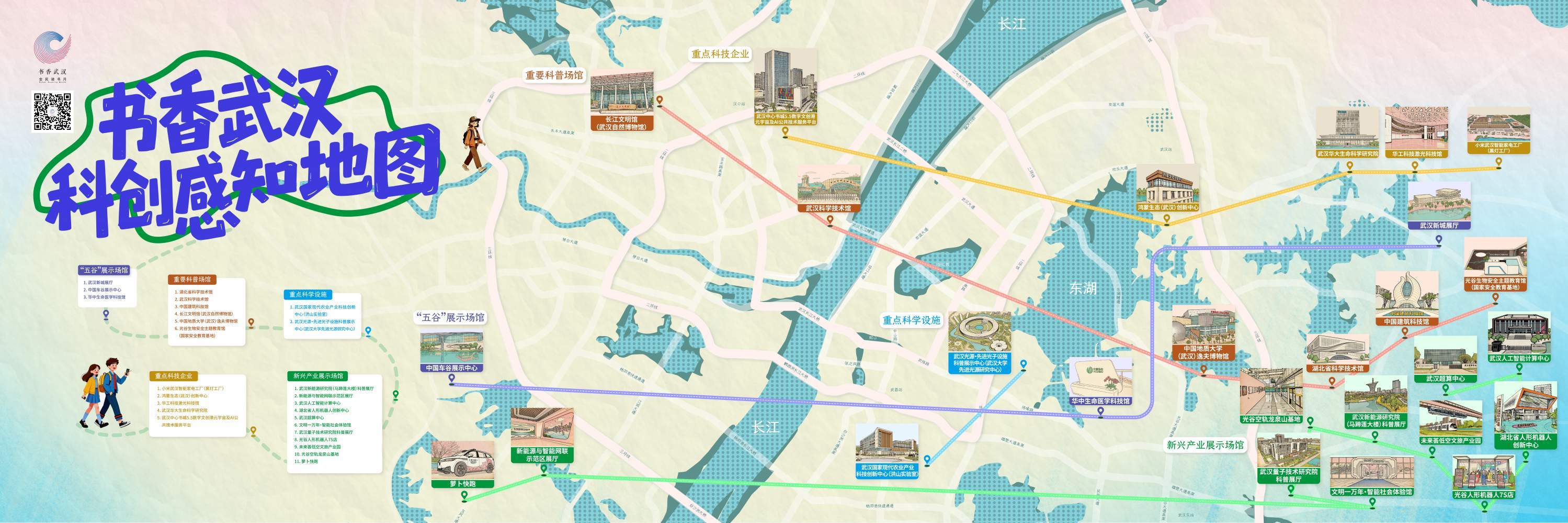 “文脉寻踪”优秀传统文化体验线带市民走进黄鹤楼、古琴台、江汉关博物馆等;“红色薪火”红色文化阅读感悟线串联武汉革命博物馆、 毛泽东旧居、中共五大会址、八路 军办事处、宋庆龄故居等;“科创赋能”科普阅读探索线深入光谷、武汉经开区,以及人工智能与算力领域的相关企业;“人与自然”生态文化阅读探索线则走向中国科学院武汉植物园、东湖落雁景区、长江文明馆、金银湖湿地公园和汉口江滩等;“匠心传承”非遗与艺术阅读体验线带领市民走进汉绣博物馆、苏恒泰油纸伞工作室等。