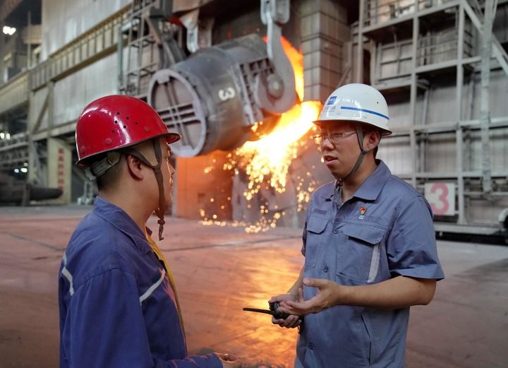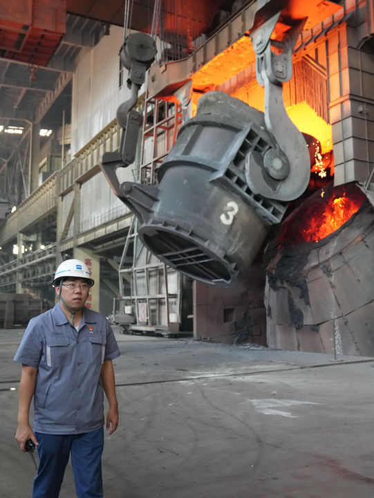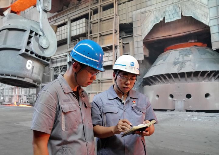 河钢集团邯钢公司邯宝炼钢厂转炉车间里,天车吊着巨型钢包隆隆划过,转炉中炉火通红,钢水翻涌。唐笑宇手持对讲机,冒着热浪叮嘱同事注意控制好转炉中间氧、出钢温度等指标。