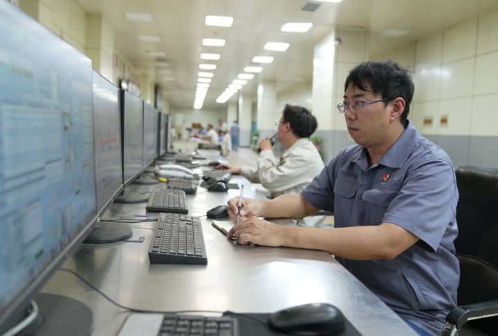 邯宝炼钢厂特档技术主管、转炉车间副主任唐笑宇(右)在转炉车间控制室工作(2022年9月7日摄)。