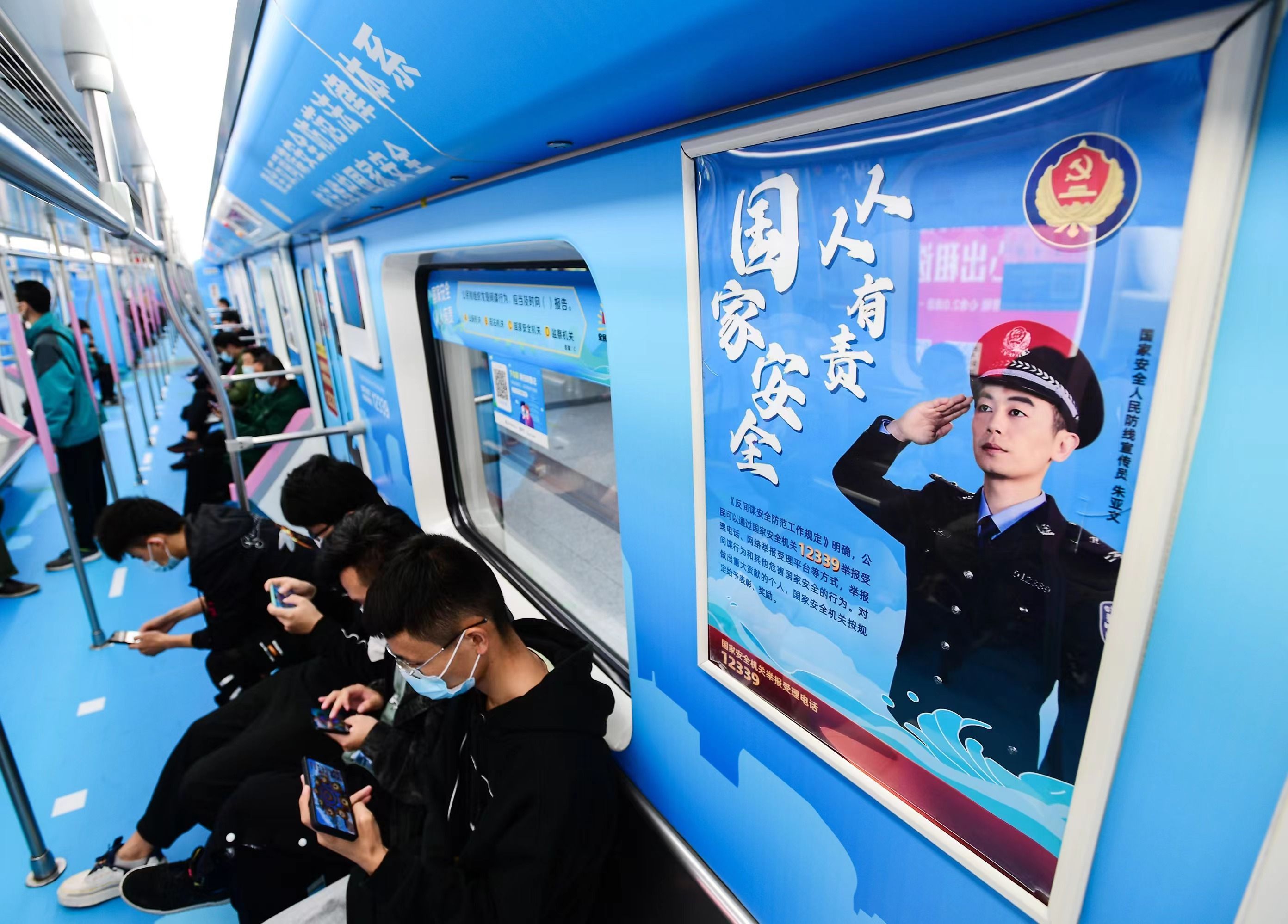 2022年4月15日,乘坐武汉地铁2号线的市民坐进“12339地铁专列”,身临其境在车厢内学习国家安全知识。