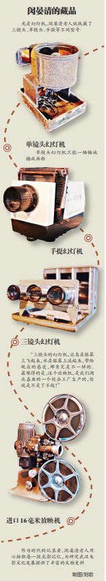 光是幻灯机,闵晏清就收藏了三镜头、单镜头、手提、迷你四种不同型号的,其中三镜头的那个幻灯机,他觉得最为难得。“之前我们用的单镜头幻灯机,只能一幅幅像放图片一样播放,三镜头的幻灯机,让鸟在银幕上飞起来,水在银幕上流起来,带给观众的感受,那肯定是不一样的。最难得的是,这个放映机,是我们湖北嘉鱼的一个校办工厂生产的,你说是不是了不起!”