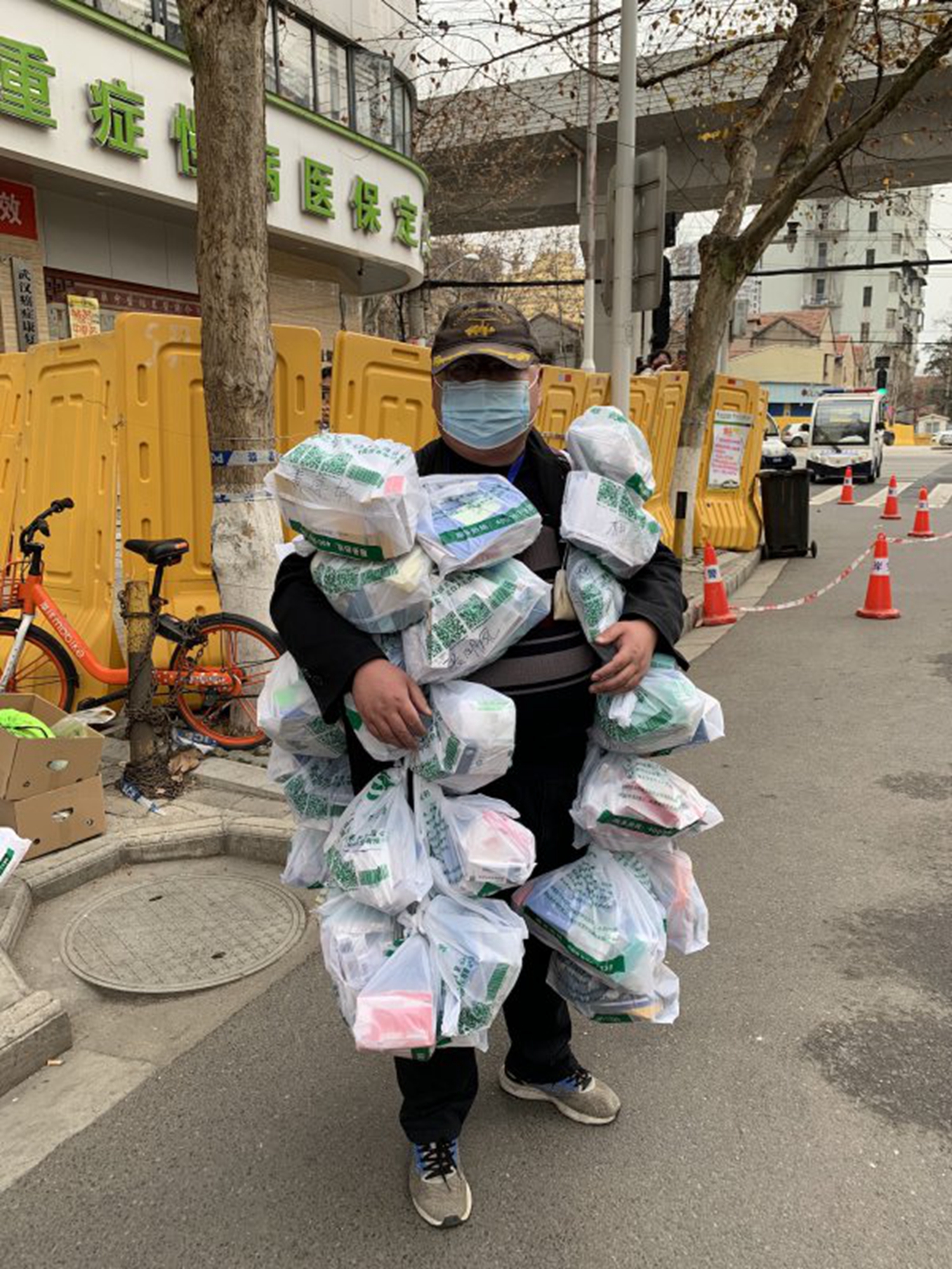 交通阻隔的时刻,居民买药成了难题。江岸区后湖街道惠民苑社区网格员丰枫奔波在街头,清晨5时出门,10多个小时后拿齐近100份药。他身上挂满药袋的照片,在网络上传开后令无数人泪目,有网友评论说就像“游戏里的大英雄”。