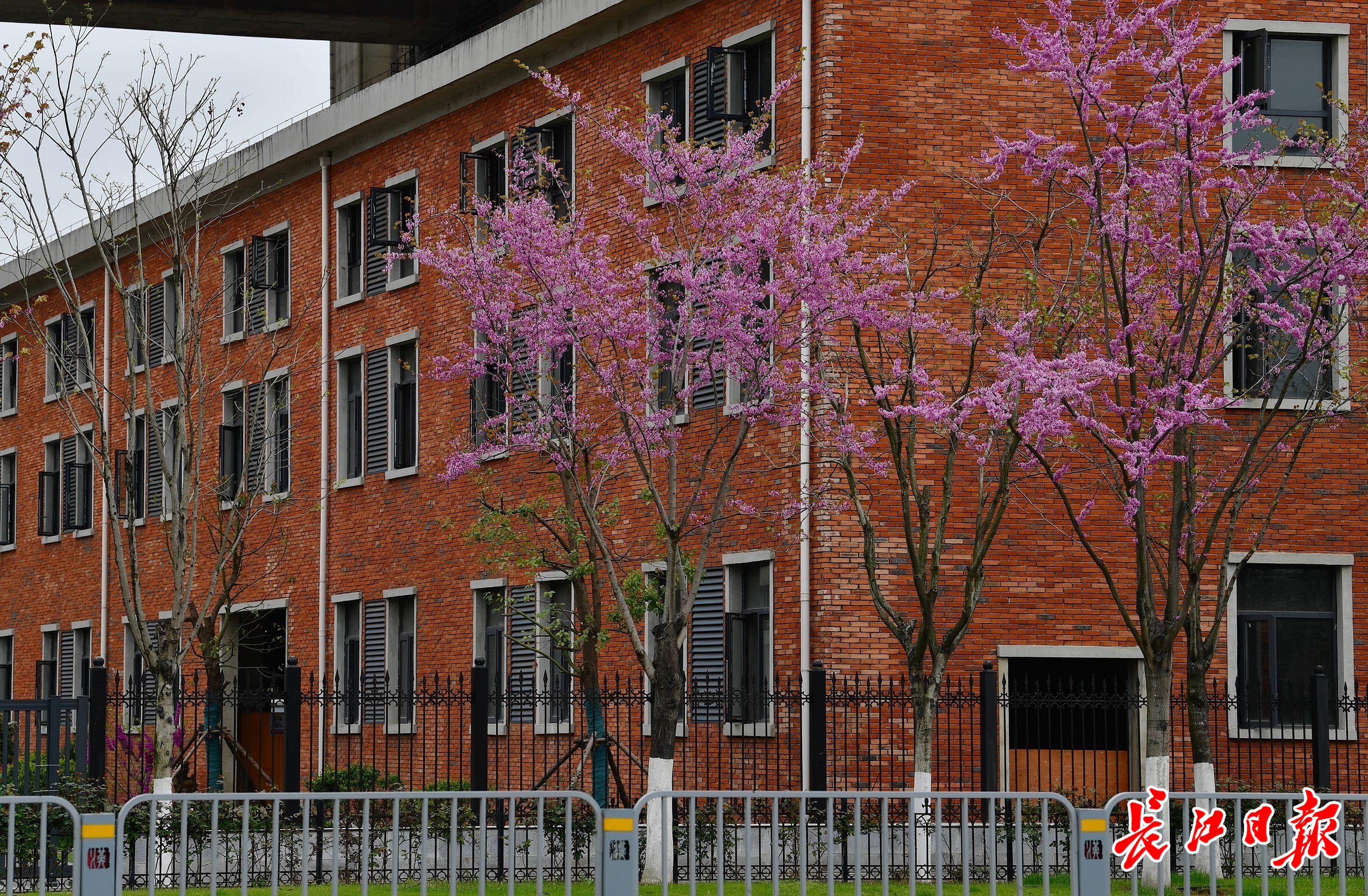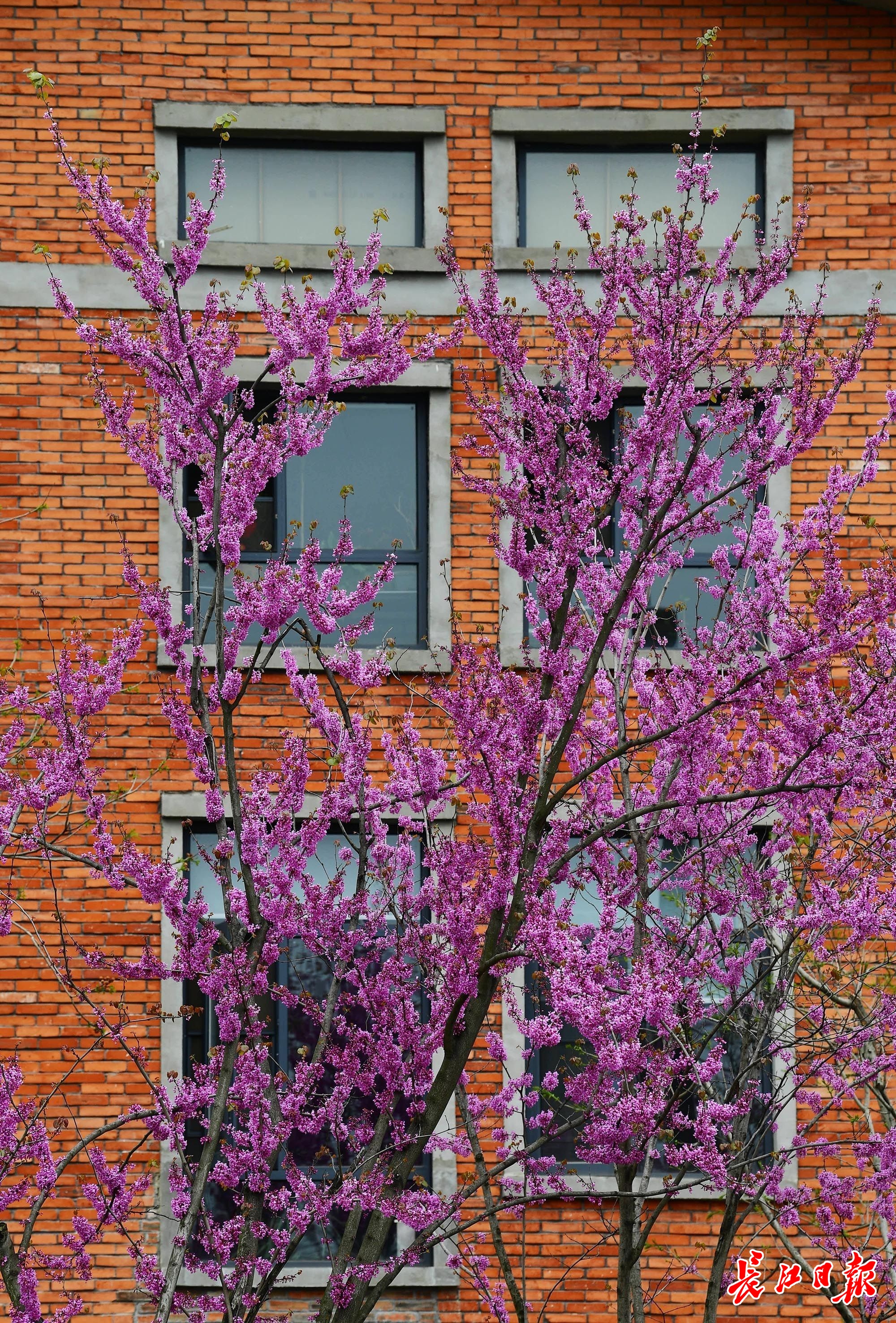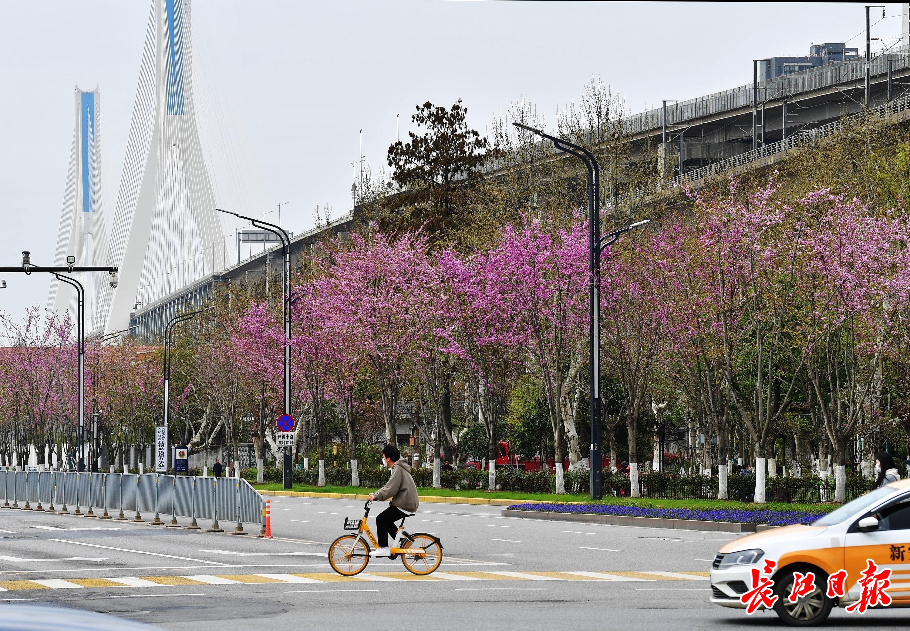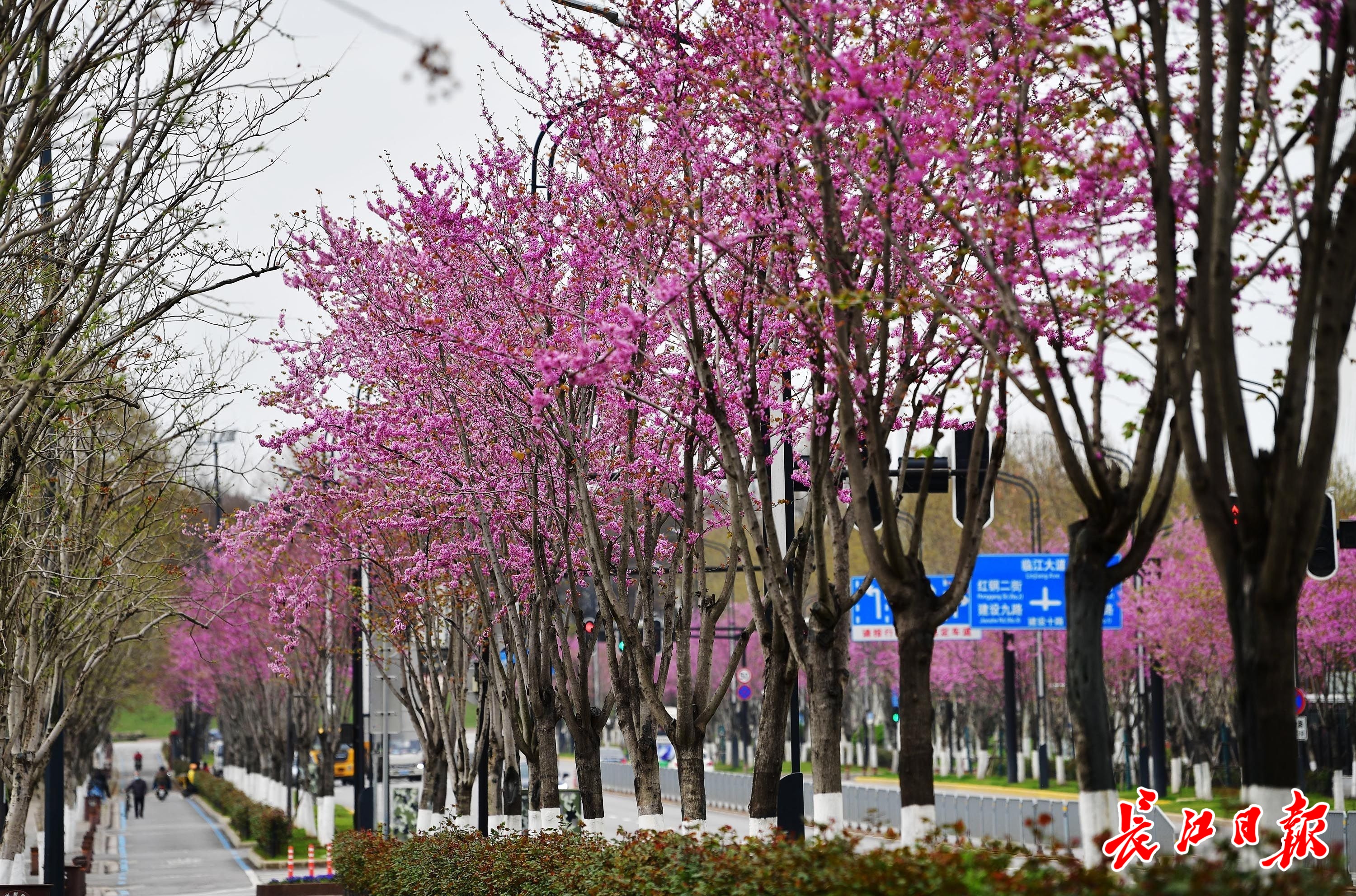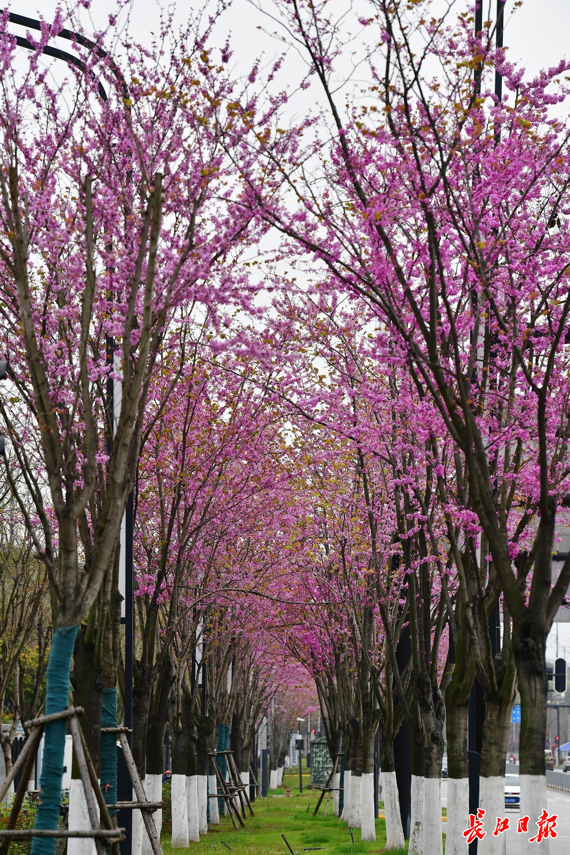 3月27日,武汉市青山区建设十路两边,270余株高大的树木被密密麻麻的花串染成了紫红色,一个个枝条上爬满了紫蝴蝶形状的花朵,远看如红云漫卷。