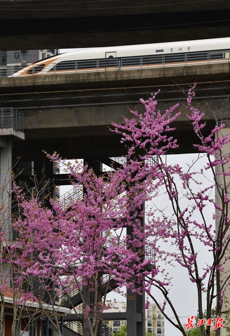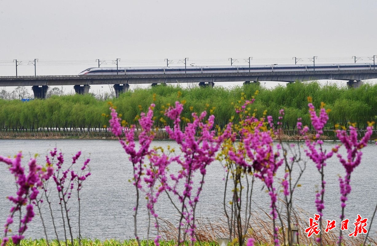 3月26日,东西湖区黄塘湖公园,高铁列车与绿树红花相映成景