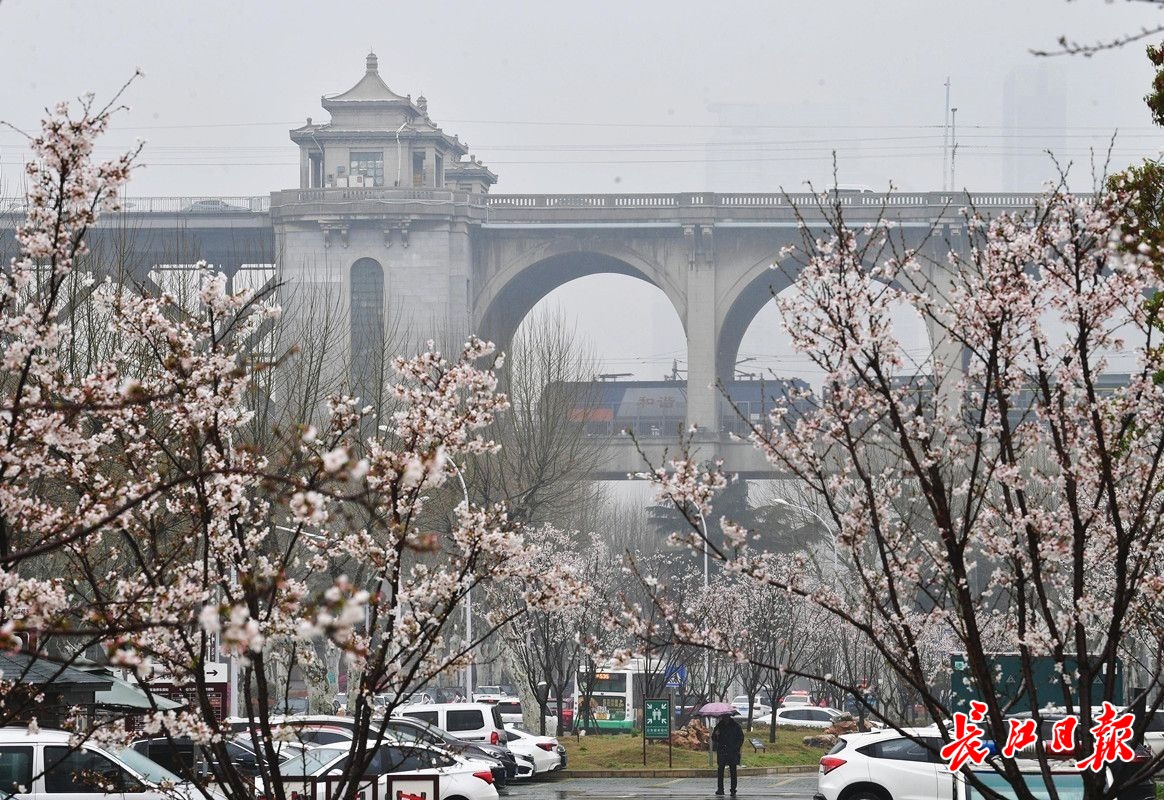 3月21日,火车穿行长江大桥,龟山公园里樱花盛开。