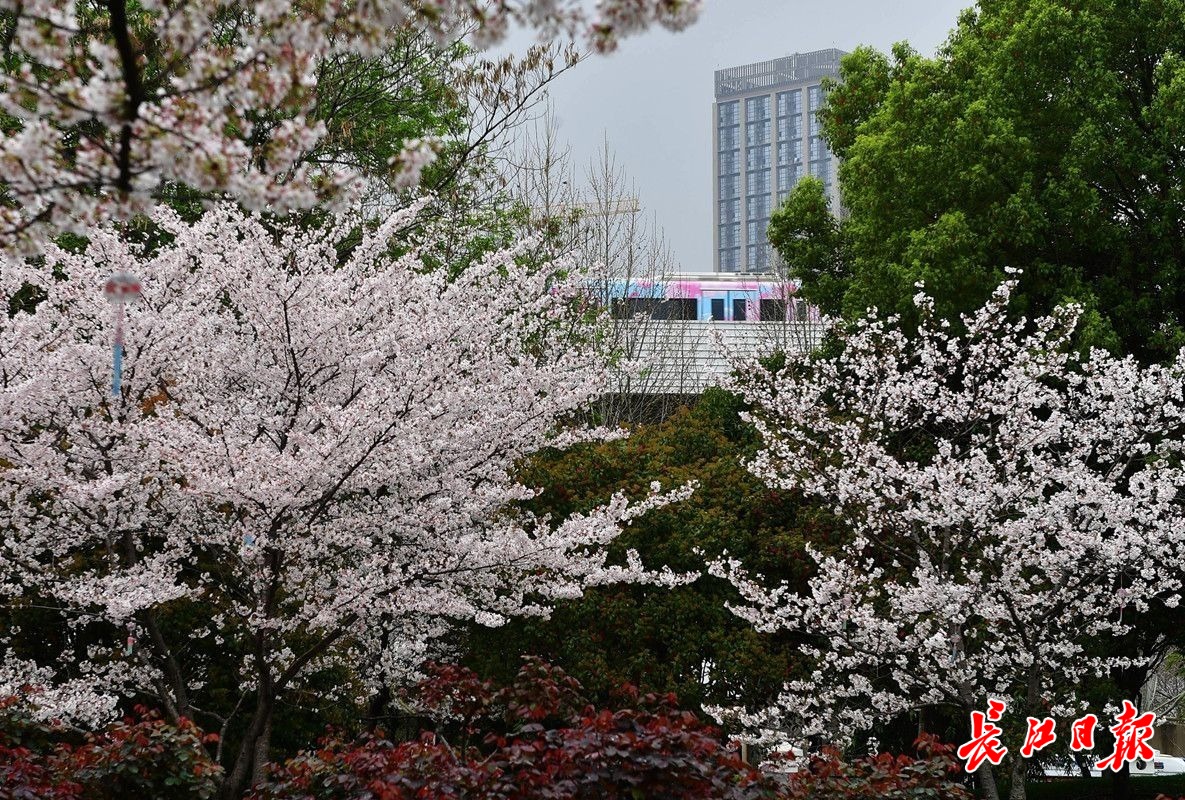 3月23日,堤角公园里樱花如雪,轨道交通1号线“樱花列车”从花树间一闪而过。