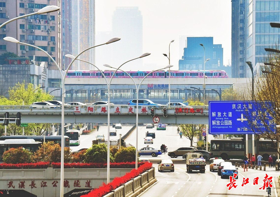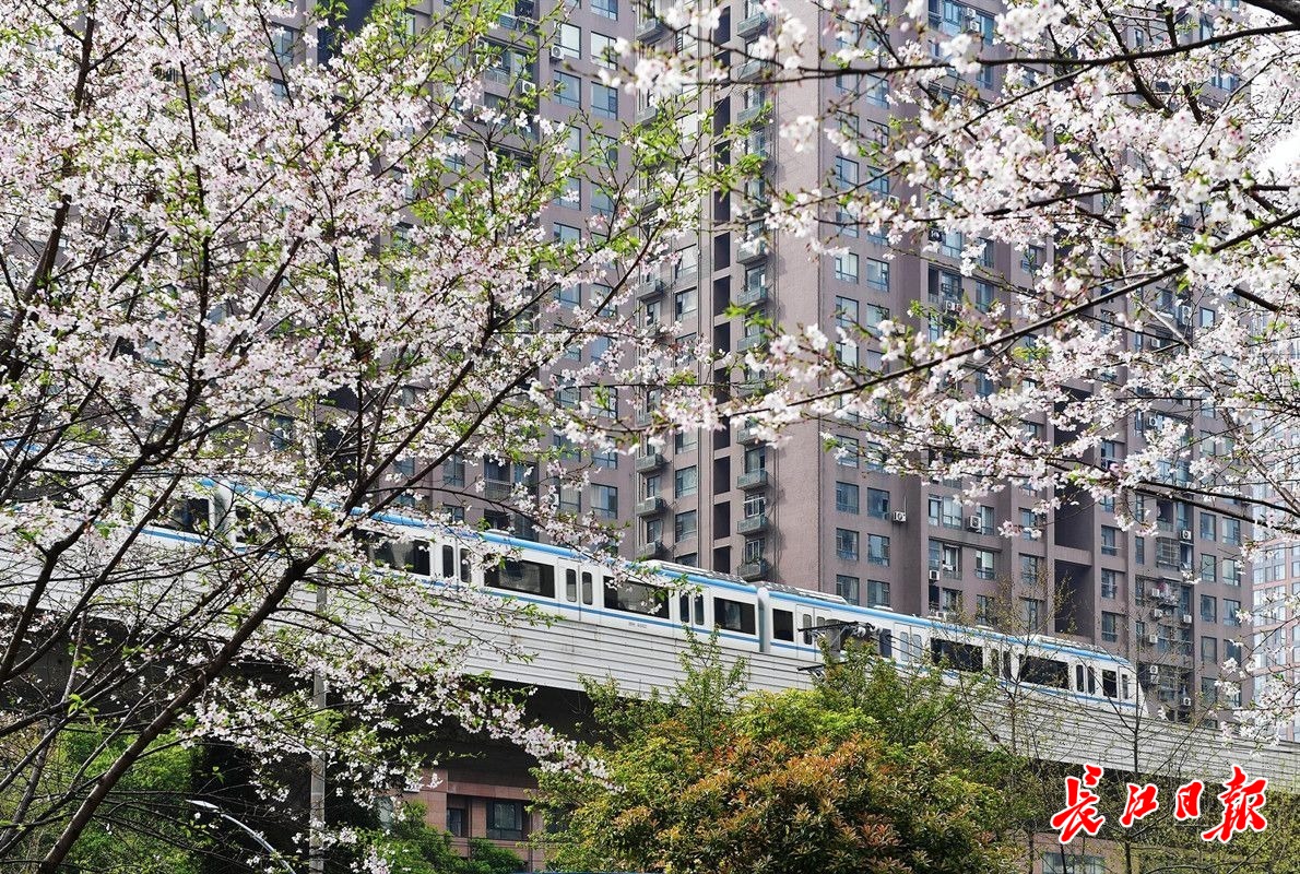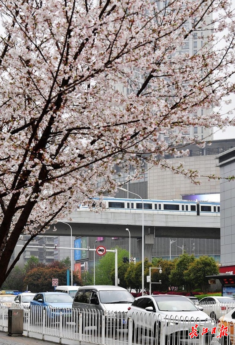 3月21日,江汉路旁樱花盛开,轨道交通1号线列车从高架轨道上驶过