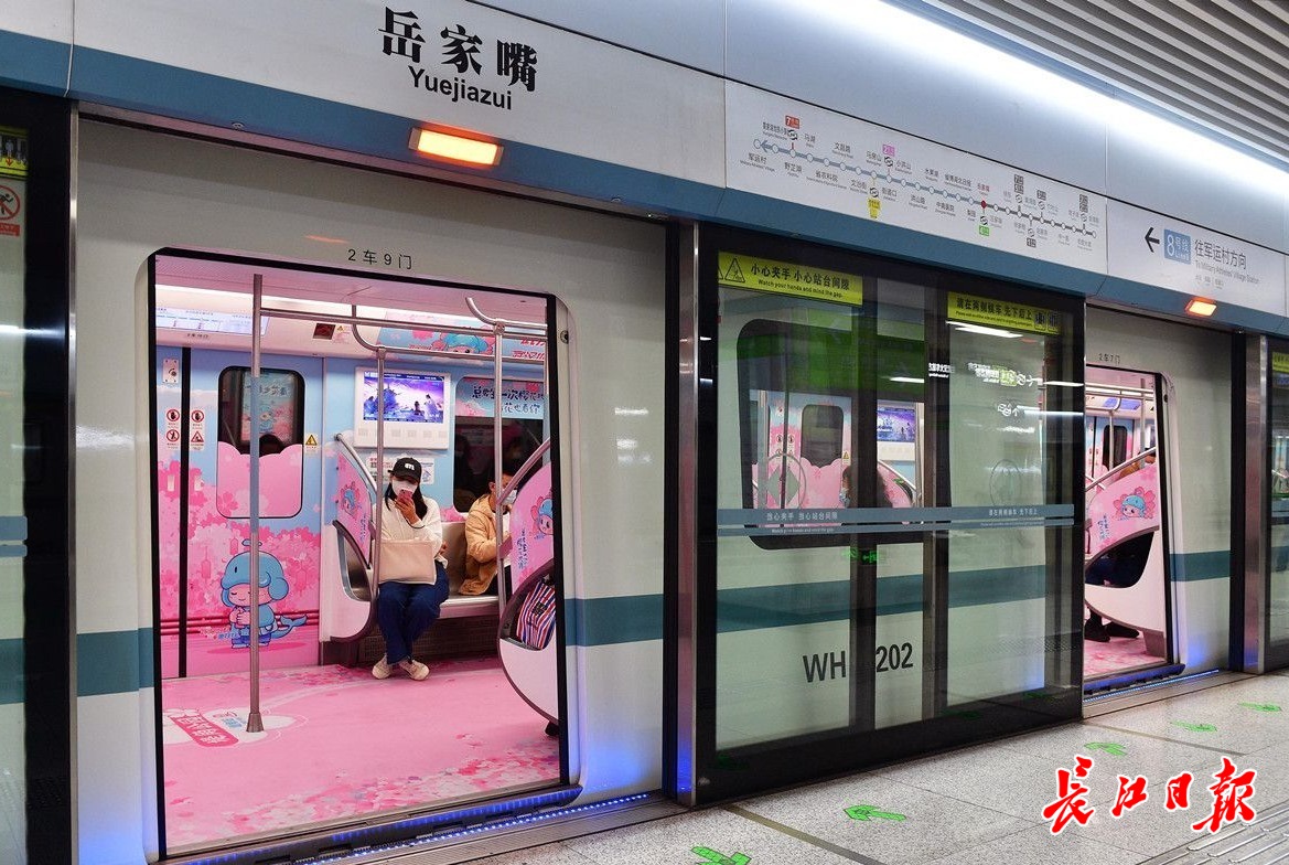 地铁8号线“樱花专列”内部装饰成了粉色的“樱花海洋”