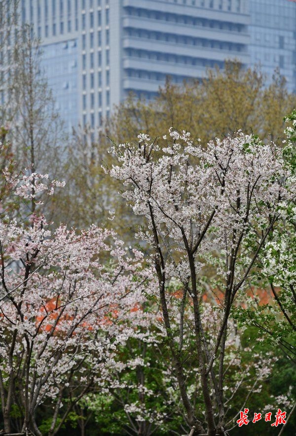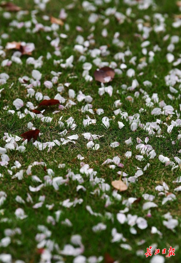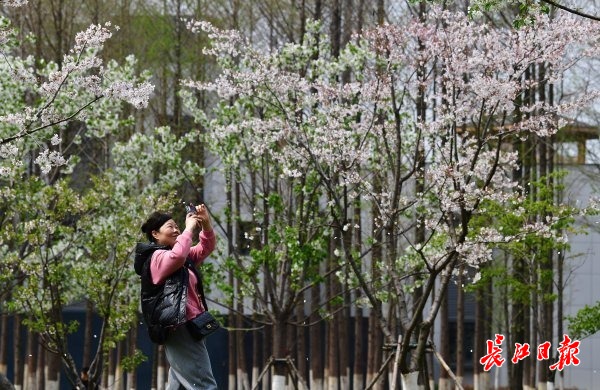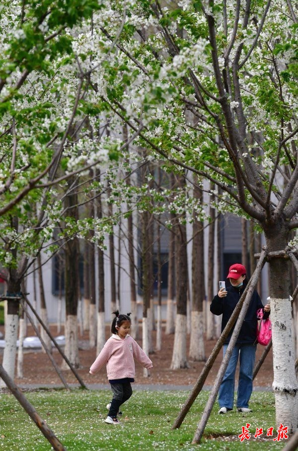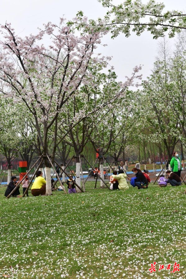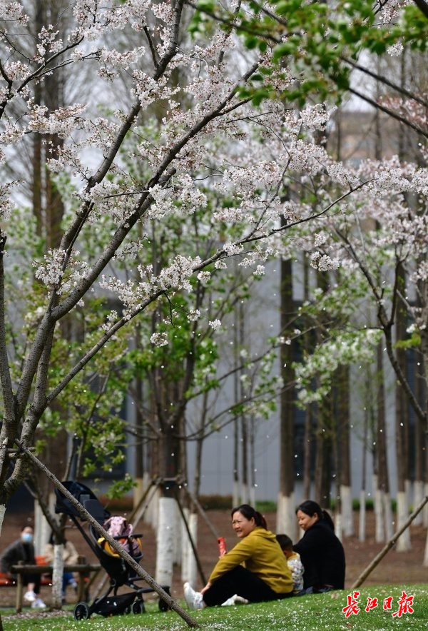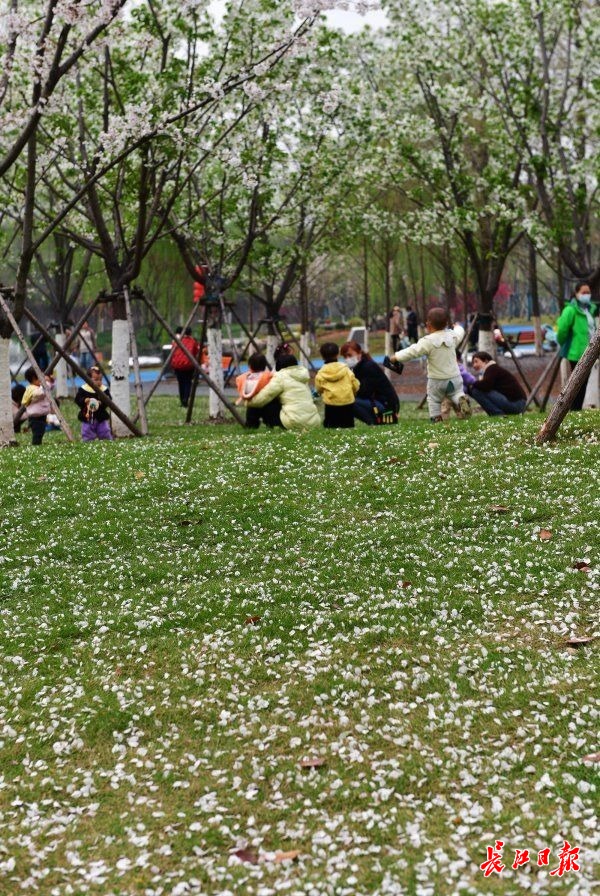 23日,武汉市常青公园的樱花林内,近百株大岛樱和染井吉野樱花开满枝头。午间,日头时隐时现,和煦的春风徐徐吹来,无数花瓣翩翩洒落。游园的市民纷纷赶来樱花树下,在铺满花瓣的草地上带着孩子玩耍,用手机拍摄樱花漫天飞舞,陶醉在浪漫的芳菲春色之中。