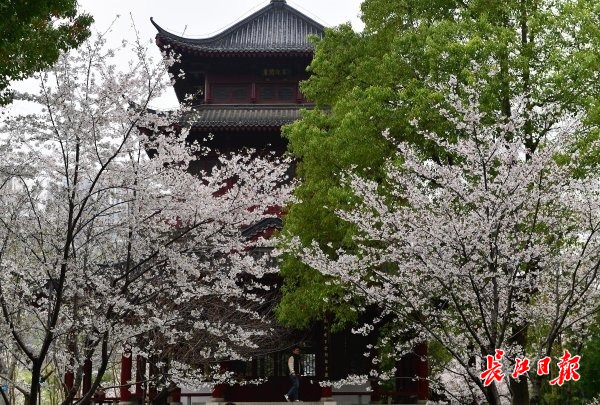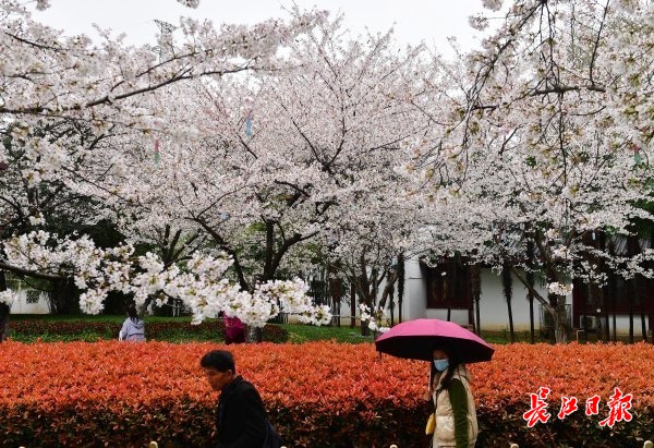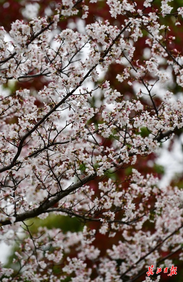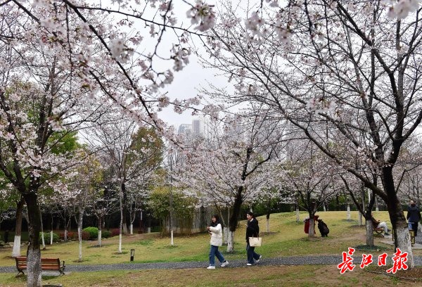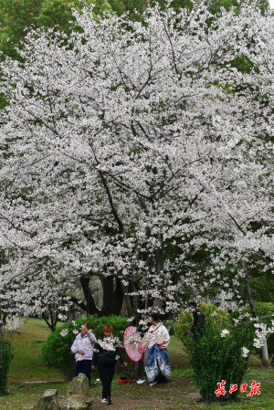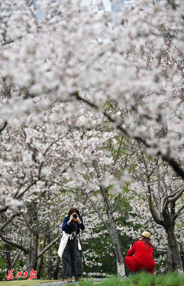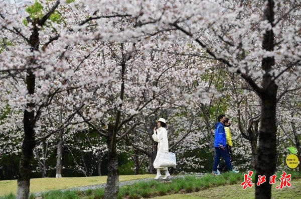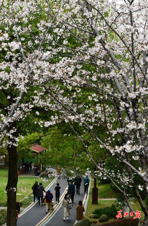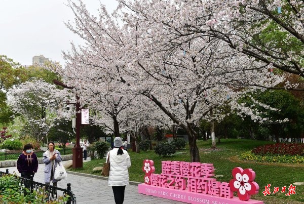 近日,武汉市堤角公园内众多树形高大、花枝繁茂的染井吉野樱进入了盛花期,园内随处可见白中透粉的樱花如片片云霞缭绕,远远望去好似多了一份仙气。众多市民在园内赏花拍照,将樱花美景嵌入相框。