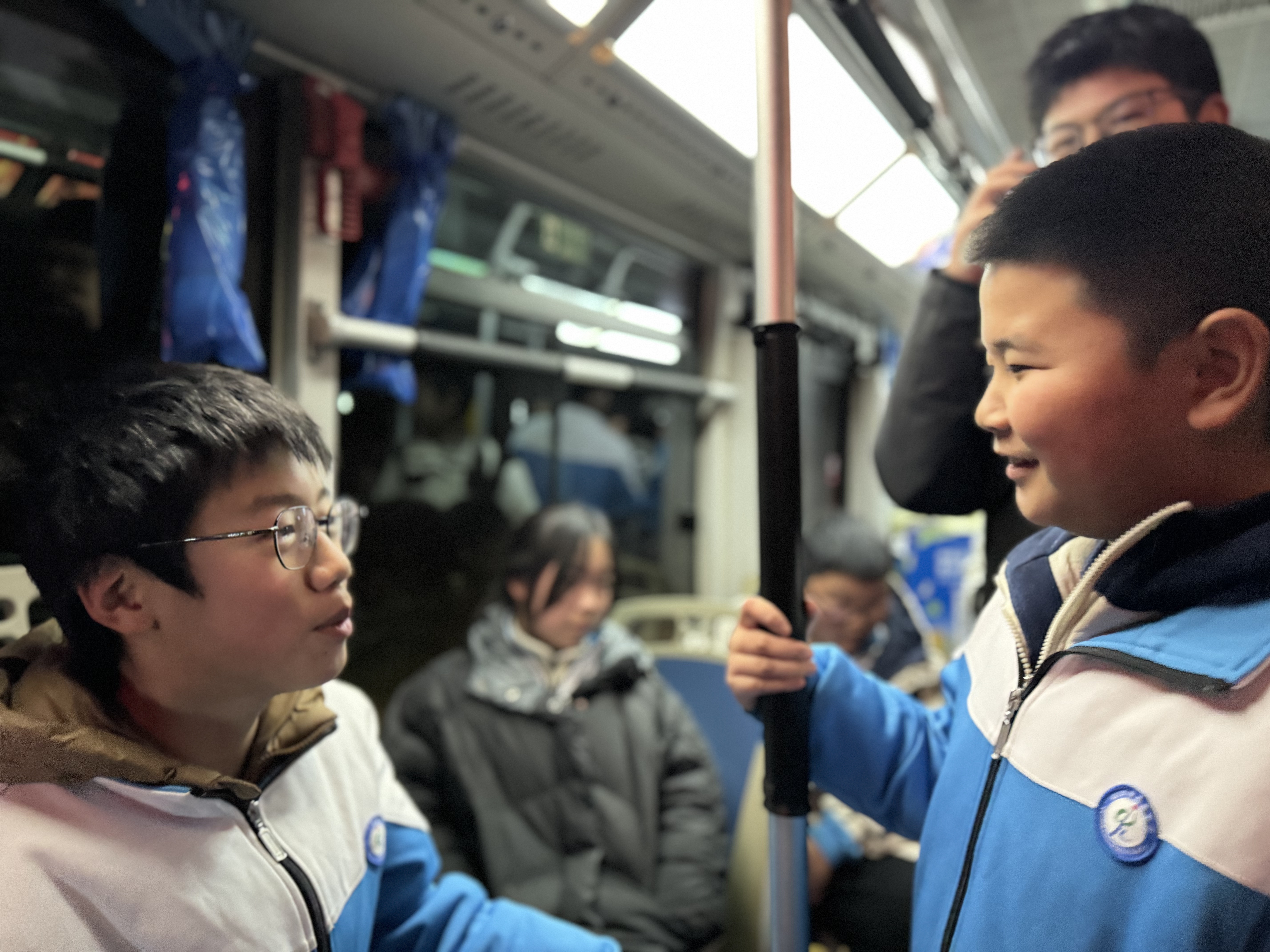 30日放学后,项顺坤(左)和同学乘坐通学定制公交回家