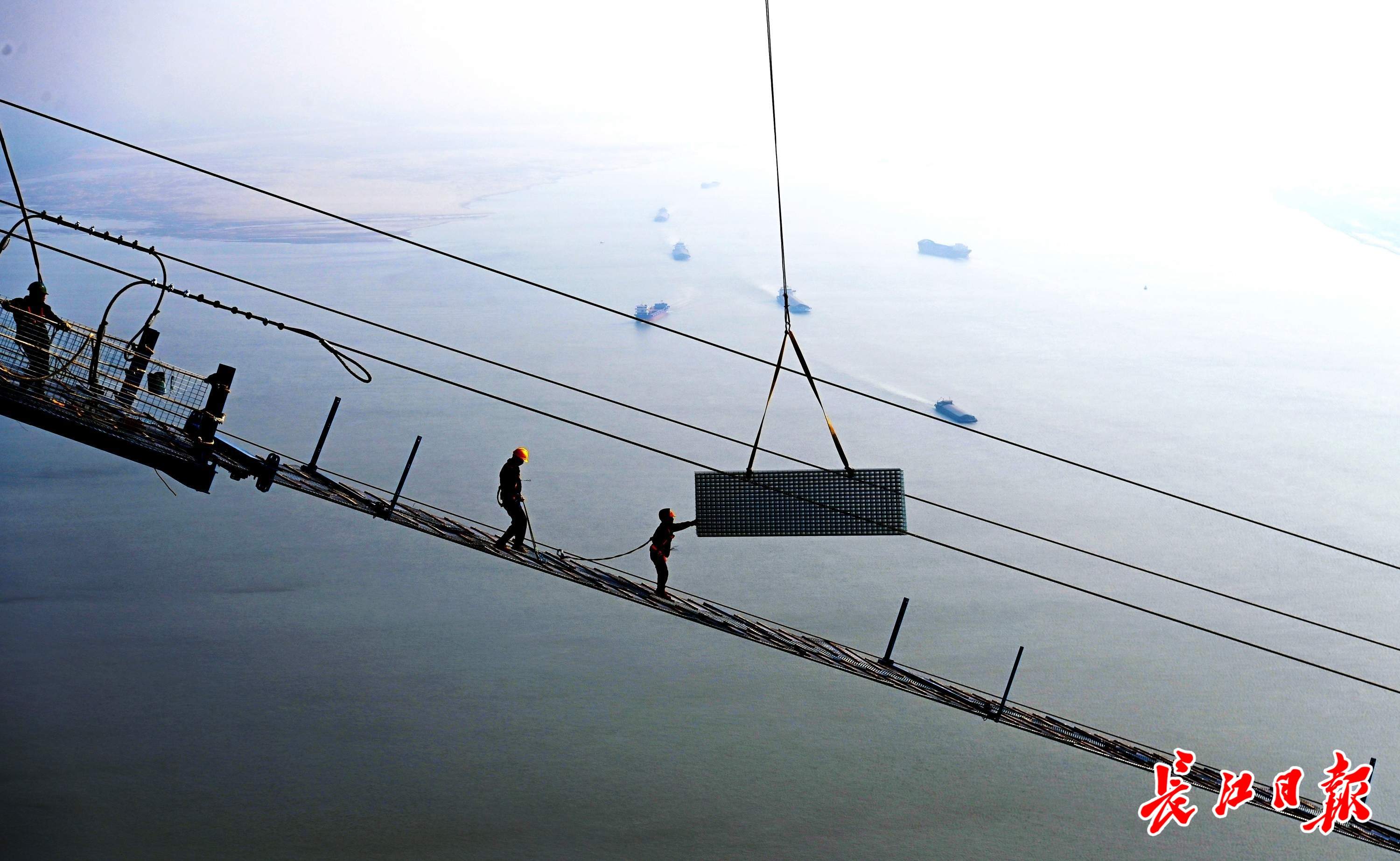 2024年12月13日,施工人员在双柳长江大桥铺设猫道。为防止施工材料掉进长江污染江水,施工人员在猫道上铺设了密实的钢网。