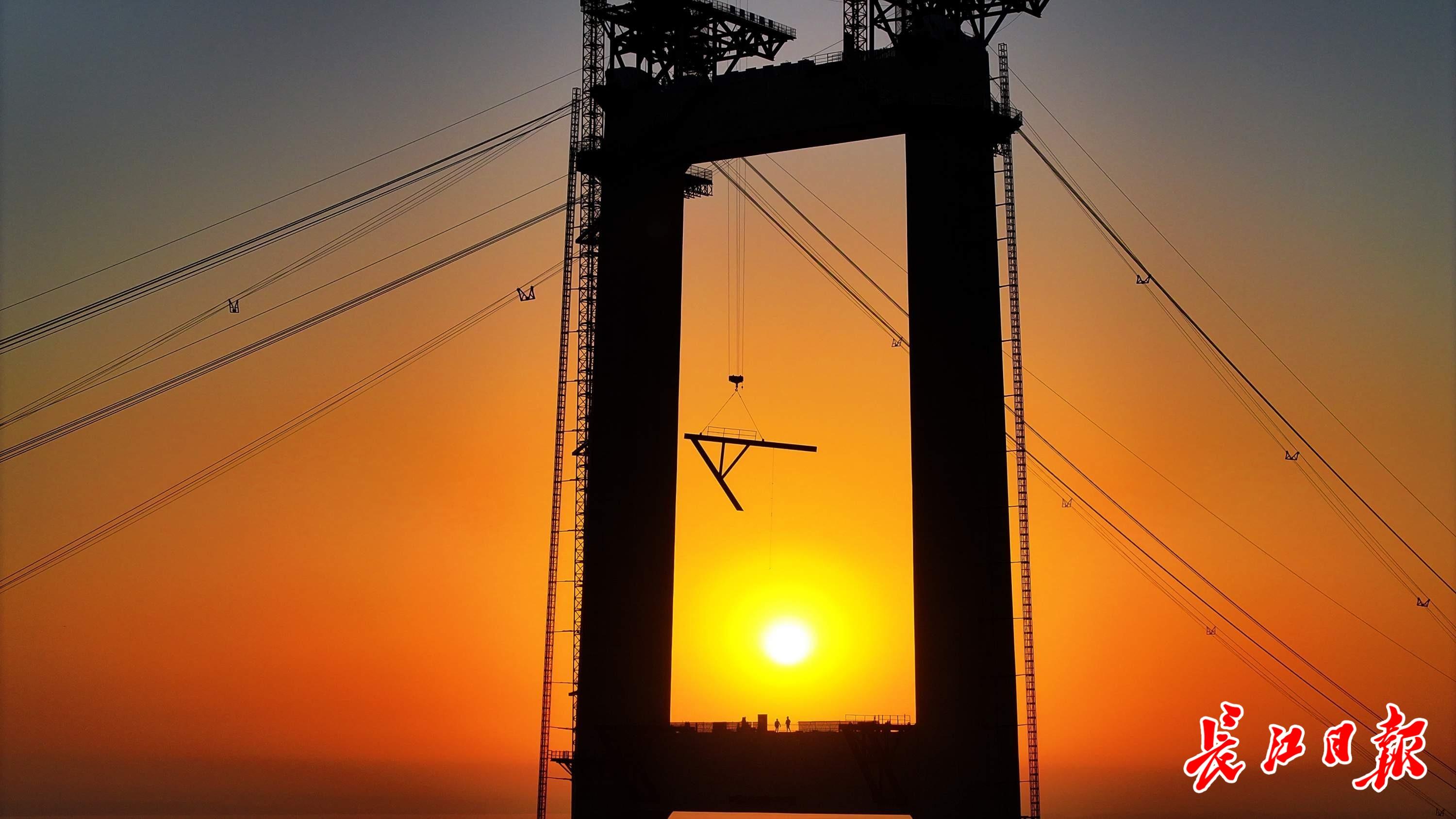 2024年11月28日7时17分,太阳刚露出水面,大桥施工人员赶在长江江豚出没高峰时段前错峰施工。