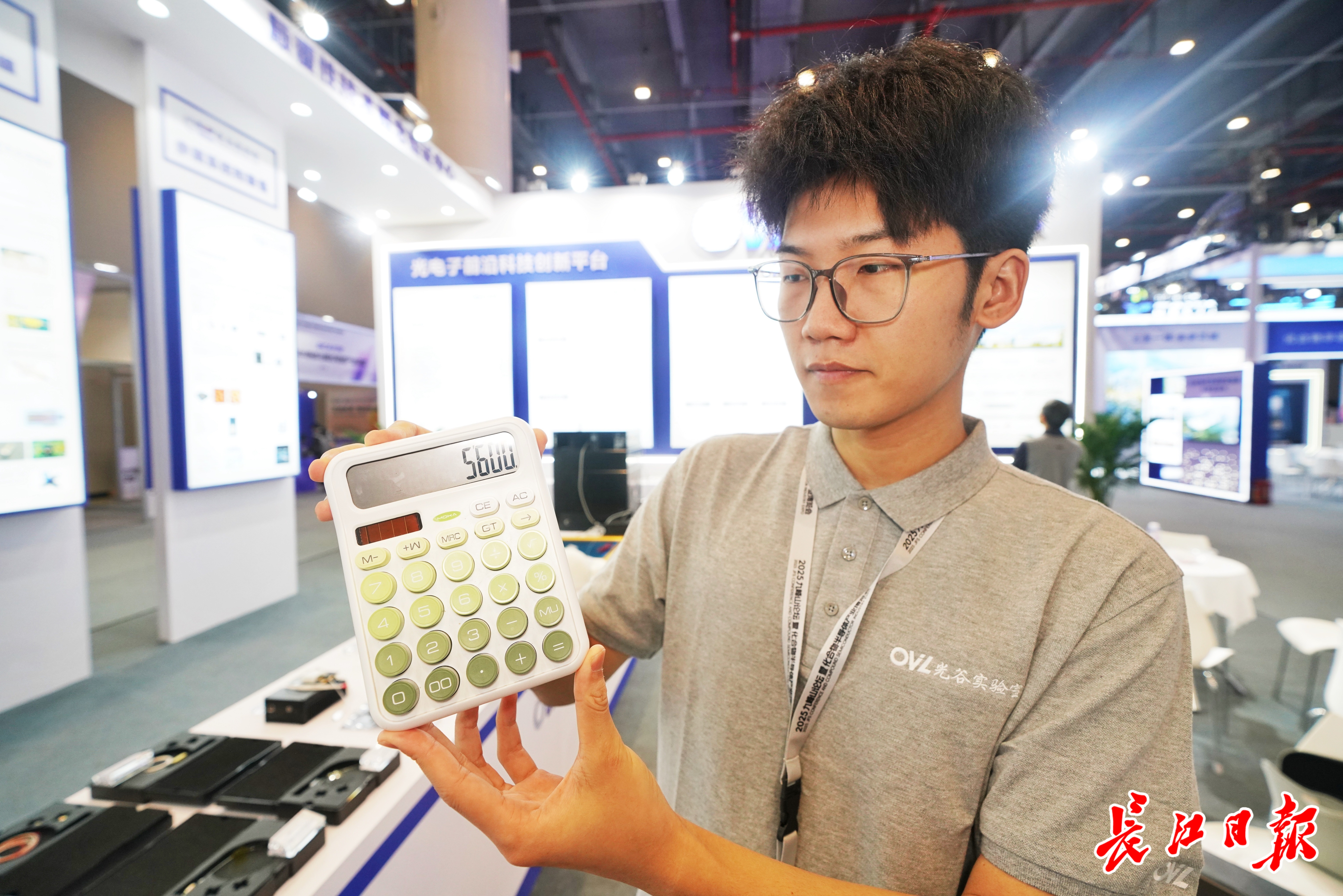 4月24日,光谷实验室在九峰山论坛展馆现场,由华中科技大学机械科学与工程学院陈炜教授团队研发的光能转换技术,利用钙钛矿吸收室内光线和太阳能转化为电能,使计算器正常使用