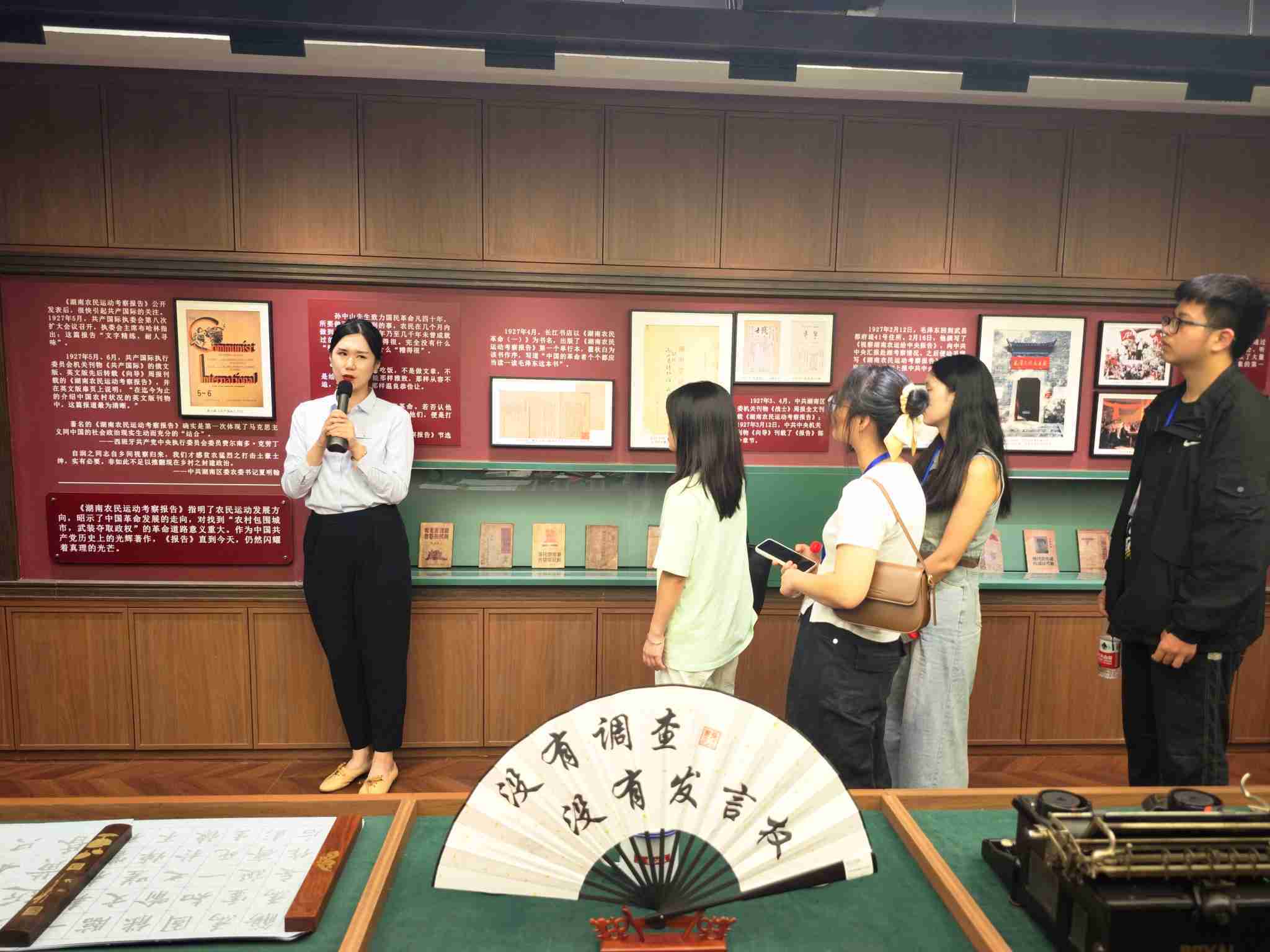 书店二层“没有调查 没有发言权”主题展陈无声讲述了《湖南农民运动考察报告》的问世历程,深刻诠释着中国共产党“调查研究”这一传家宝的精髓。在文化体验区,大学生们饶有兴致地体验拓印与活字印刷术。