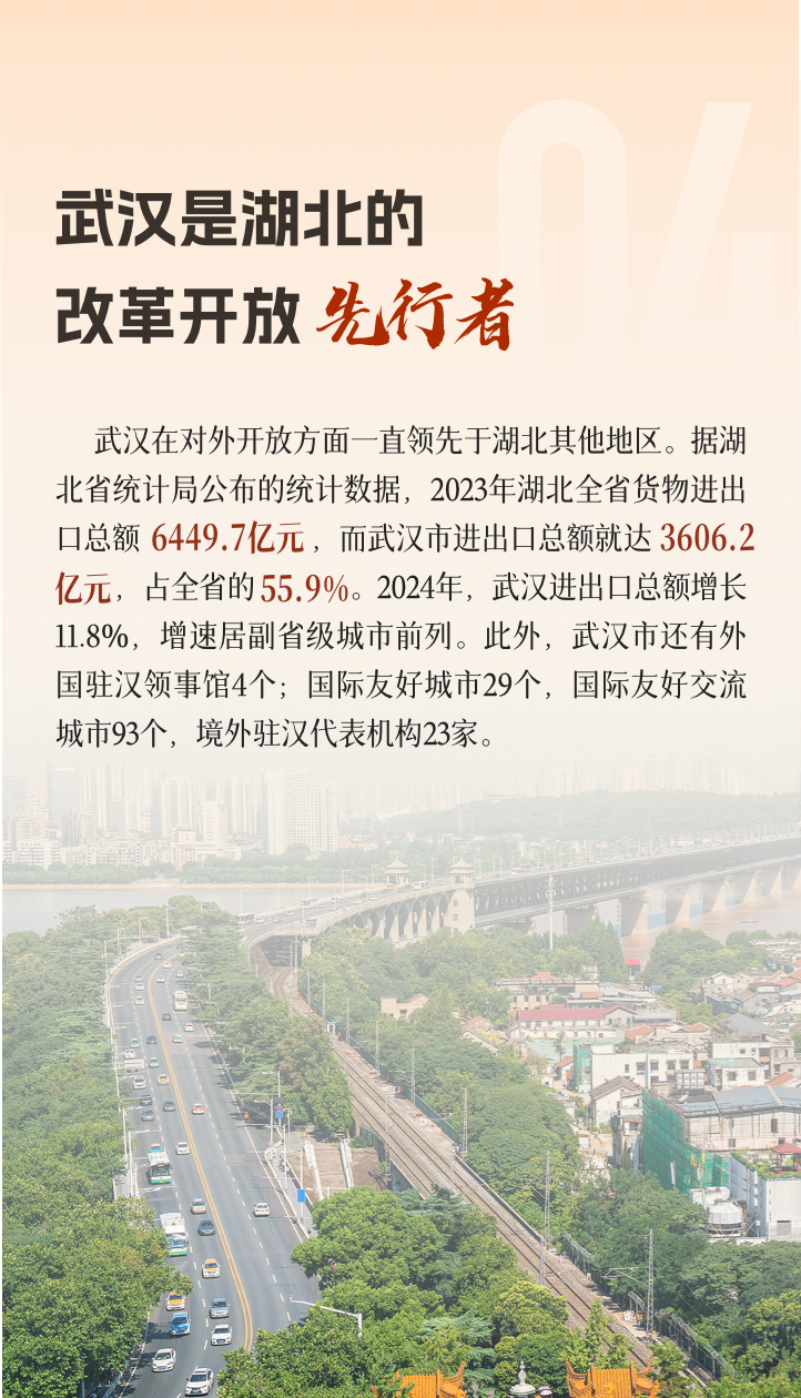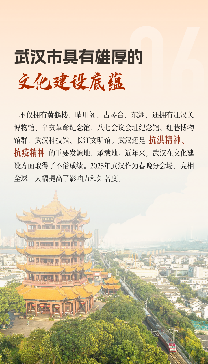 长江与汉江穿城而过,赋予了武汉深厚的历史底蕴与坚韧的城市品格。九省通衢的地理优势,使武汉成为连接南北、贯通东西的交通枢纽。作为国家历史文化名城、国际湿地城市,武汉正积极谋划未来,全力放大科创、交通、文化、生态等多重优势,朝着世界知名文化旅游目的地的目标大步迈进。