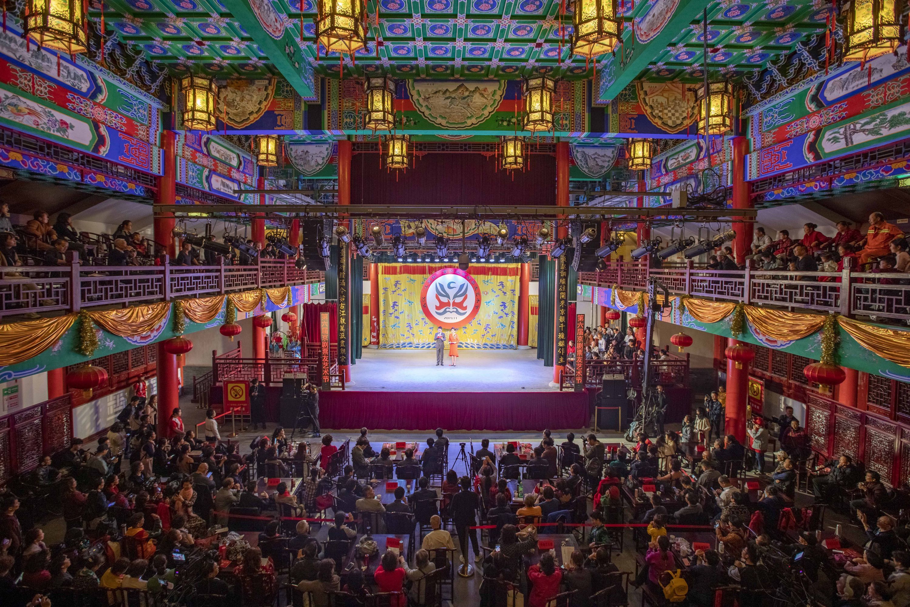 水袖翻飞映着朱漆廊柱,《定军山》唱腔里萦绕谭派传承,每到节假日,戏楼内灯火阑珊、锣鼓喧天。