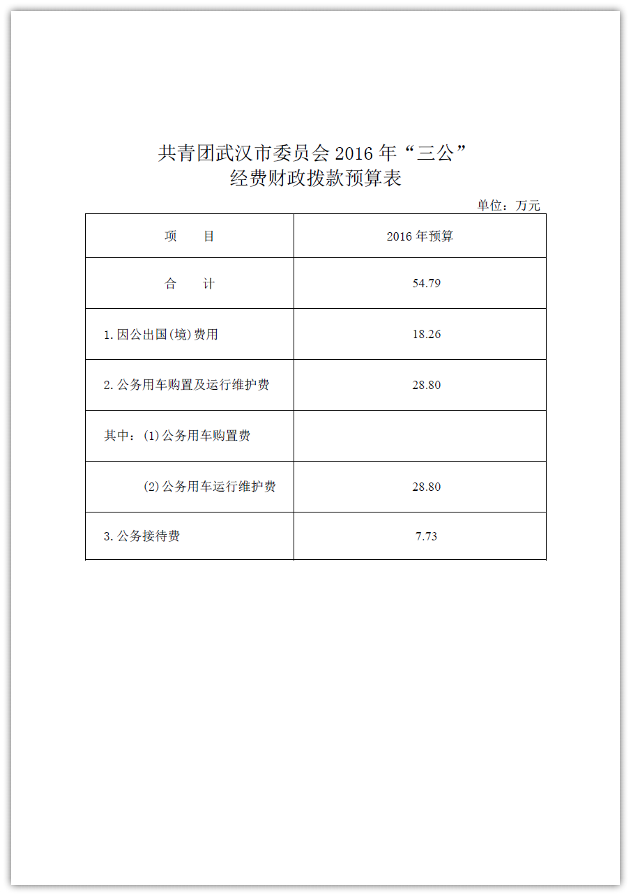 共青团武汉市委员会2016年“三公”经费财政拨款预算表