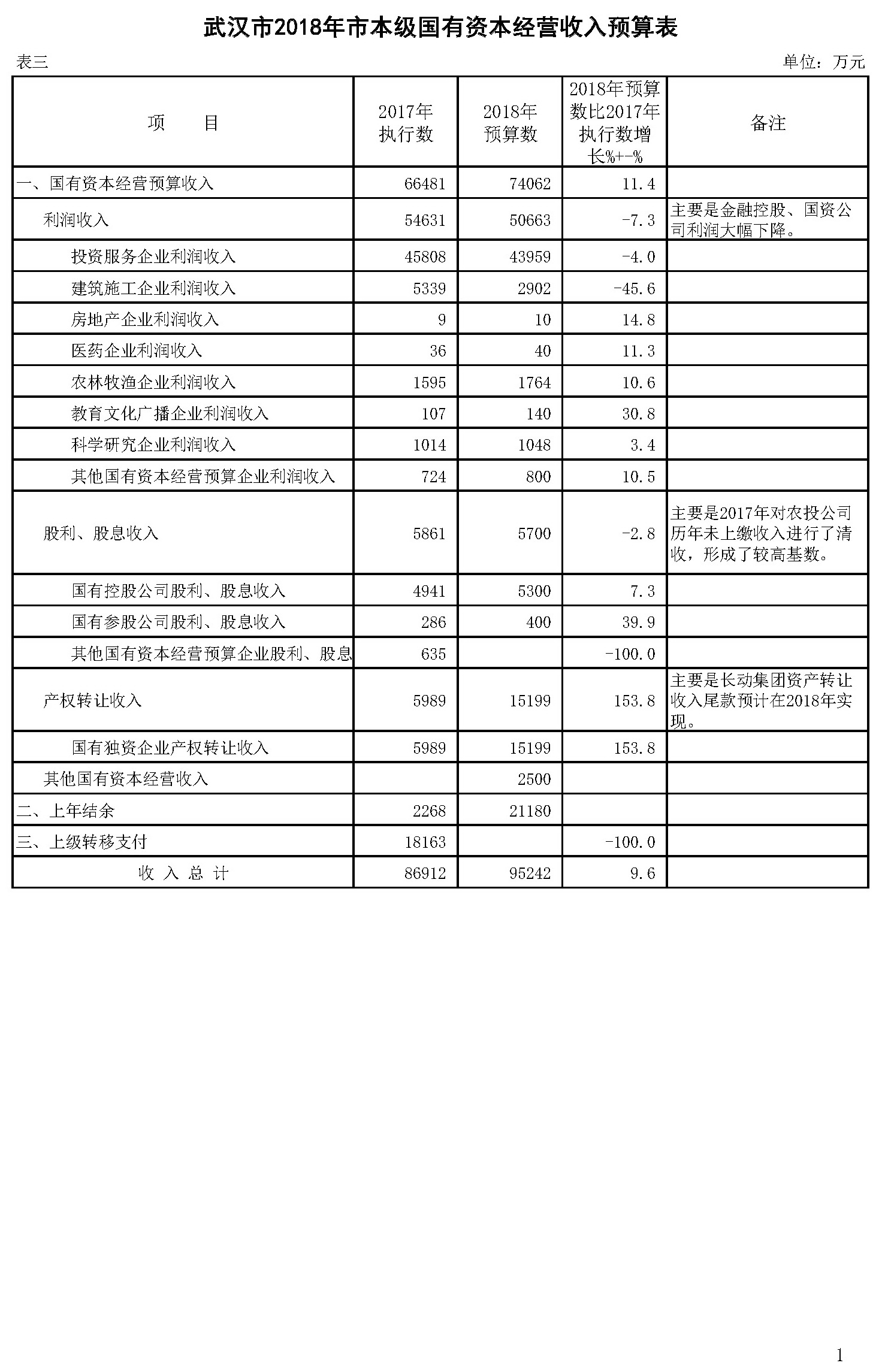 武汉市2018年市本级国有资本经营收入预算表