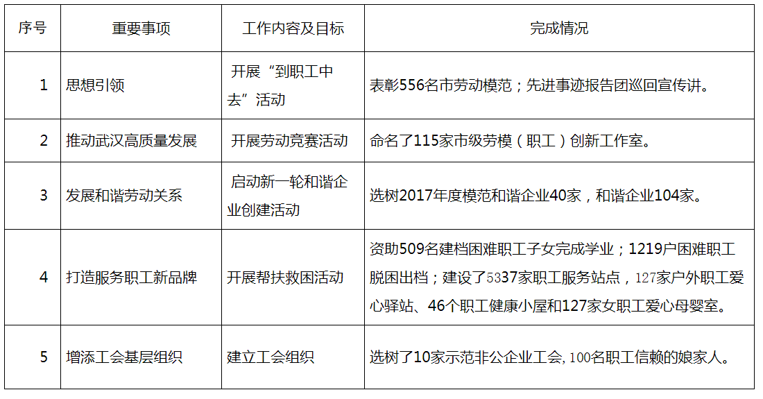 完成情况:2018年,在市委和省总的正确领导下,全市各级工会组织深入学习贯彻党的十九大精神和习近平总书记视察湖北重要讲话精神,紧紧围绕全市中心工作大局,聚焦工会主业主责,引领职工建功立业,不断夯实基层基础,推动工会改革创新,全市工运事业得到了进一步发展。