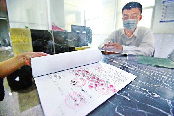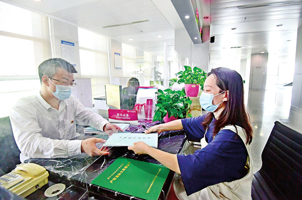武汉农村综合产权交易所服务窗口工作人员为一市民办理农村产权登记业务。