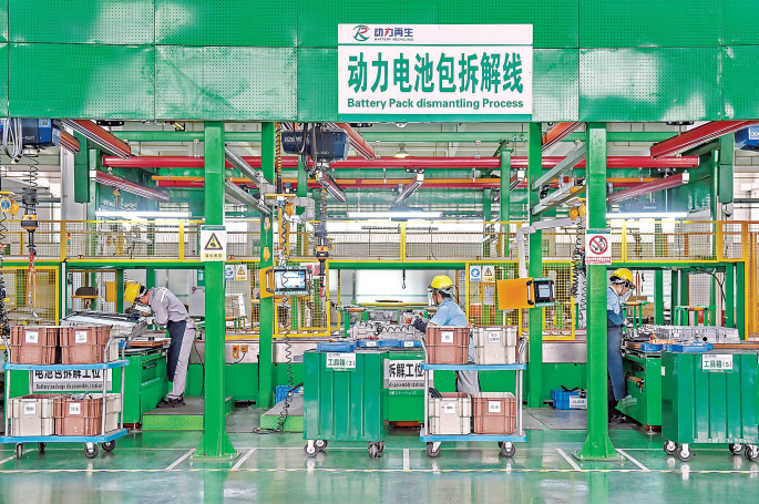 格林美员工在动力电池包拆解线上作业。