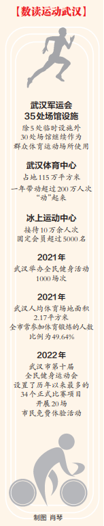 全民健身,运动之城。武汉市社会体育指导中心提供的数据显示,2021年,武汉举办全民健身活动1000场次,人均体育场地面积2.17平方米,全市经常参加体育锻炼的人数比例为49.64%。也就是说,近五成武汉市民加入了健身行列。