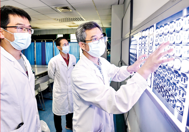 武汉大学人民医院呼吸与危重症医学Ⅱ科主任胡克(右一)向年轻医生传授经验。