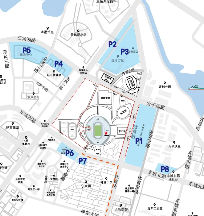 4、由于活动当日体育中心周边道路较为拥堵,货车及危化品车辆不要进入东风大道(不含)-体育路-太子湖路-芳草路(不含)-车城东路(不含)-神龙大道(不含)-东风大道(不含)合围区域内,可绕行神龙大道、车城东路等外围道路。