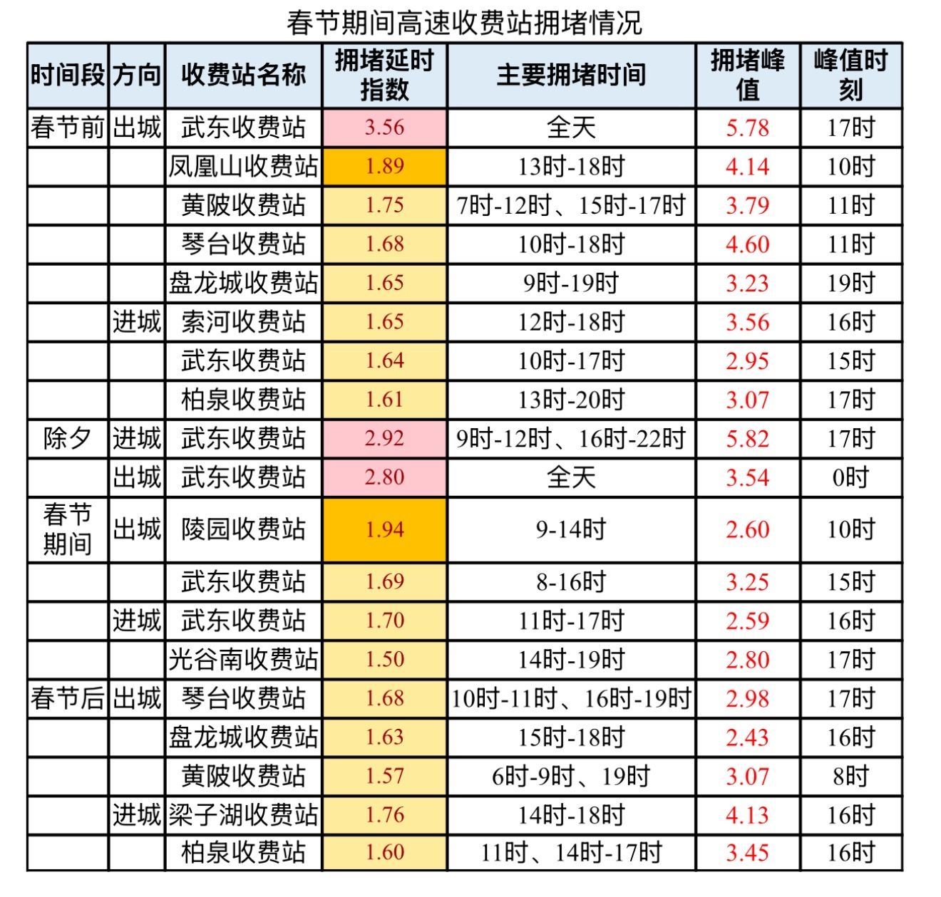节前(至2月14日):拥堵将集中在主城区快速路及主干道。重点关注二环线(竹叶山至沿江大道、红庙立交至和平立交、唐家墩至常青路、王家湾至知音桥段)、三环线(青菱立交至武金堤立交、友谊大道立交至和平大道立交段),这些路段在10时至15时可能出现严重拥堵。