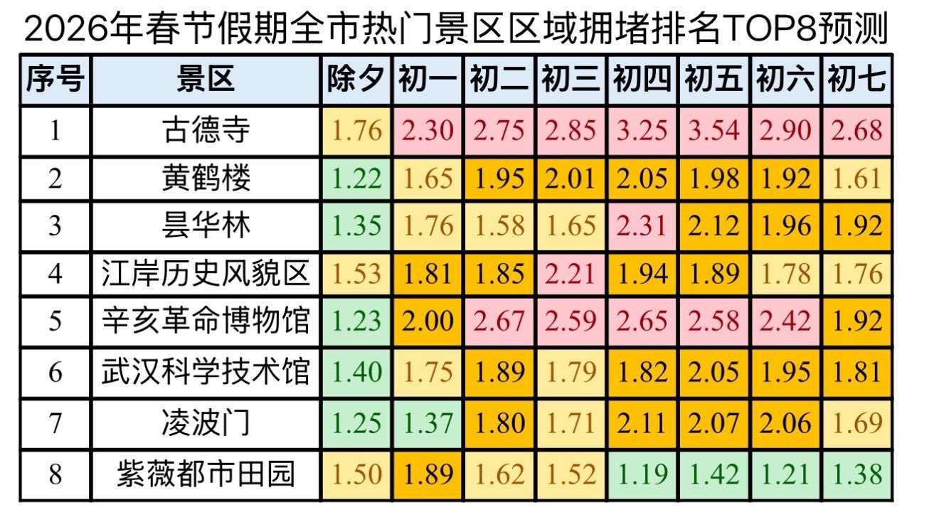 景区:古德寺、黄鹤楼、东湖梅园及各类灯会人气最旺,周边道路每日10时至16时及灯会夜场时段易拥堵。初五前往归元寺、古德寺祈福的车流人流将非常集中。