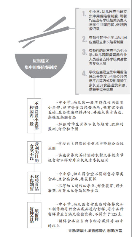 《规定》要求,学校食品安全实行校长(园长)负责制,中小学幼儿园应建立集中用餐陪餐制度。