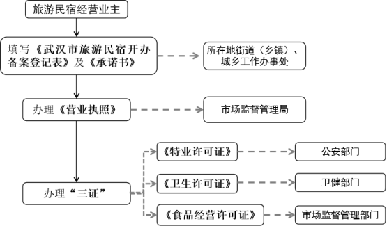 (三)明确办证流程。《意见》明确,按照“先照后证”管理办法,旅游民宿经营业主应当先向所在地街道(乡镇)提出申办经营申请,填写《武汉市旅游民宿开办备案登记表》和《承诺书》,初审合格后到所在区行政审批部门办理经营范围含有“旅游民宿”的营业执照,并经区公安、卫生健康、市场监管等部门行政许可后,方能投入正常运营。