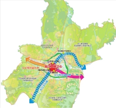 《规划》以重要城市文化空间和重点文化产业项目为节点,依托各区优势、紧盯发展大势,谋划武汉文化产业发展“一核、一轴、两带”总体布局。其中,“一核”集中打造“长江文明之心”,以长江、汉江交汇的南岸嘴为原点,以武昌古城、汉口历史文化风貌街区、汉阳月湖、龟北、归元等片区为主体,建设武汉历史人文展示区。“一轴”即在长江主城段重点建设“长江文化轴”,高水平建设一批文化旅游、滨水主题景观项目。长江北片“文化商贸融合带”重点发展文化商贸、出版传媒等重点产业,构建文化商贸服务体系,全面提升武汉文化商贸产品及服务的发展水平。长江南片“文化科技融合带”重点发展文化科技融合产业、创意设计产业,全面提升武汉文化科技创新驱动水平。各新城区深入挖掘传承“知音”文化、京剧谭门、木兰文化和问津文化等文化品牌,加强创意设计、文博会展、文化智造等产业布局,发展赏花经济、滨水生态旅游等文旅产业。