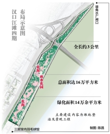 汉口江滩四期工程,上起三期室内羽毛球馆,下至堤角水厂闸口,全长约3公里。主要建设内容为滩地整治及景观工程,总面积达16万平方米。