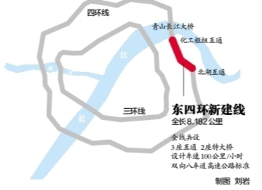 投资建设方武汉交投集团负责人介绍,东四环新建线全长8.182公里,全程高架,起于福银高速公路武汉绕城段北湖互通,终点与青山长江大桥段相接。全线共设有3座互通、2座特大桥,设计车速100公里/小时,双向八车道高速公路标准。