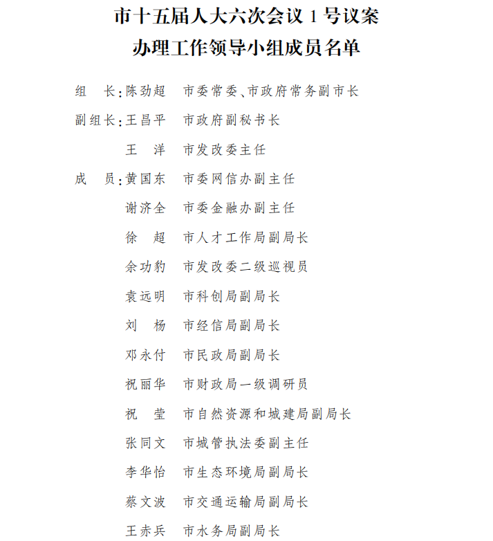 成立由市政府分管副市长任组长,市政府分管副秘书长、市发改委主任任副组长的1号议案办理工作领导小组(以下简称领导小组),领导小组下设办公室,在市发改委办公,统筹推进办理工作;领导小组办公室适时召开会议,研究解决重大问题,定期向市人大常委会汇报工作进展,及时公开办理成效,接受群众监督。各责任单位明确牵头处室(部门)及联络员,做好信息收集和反馈,定期向领导小组办公室报送办理工作情况。办理工作结束后领导小组自动撤销。