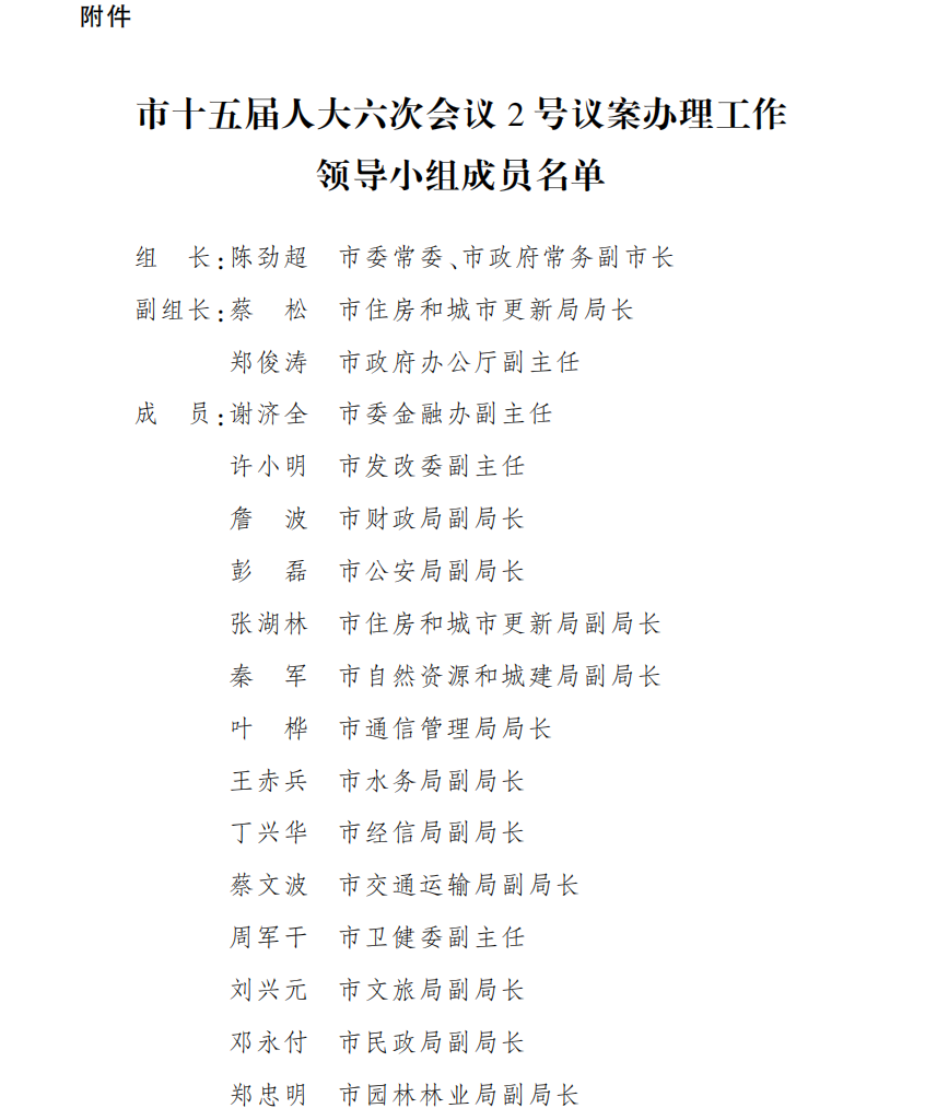 成立由市政府分管副市长任组长的2号议案办理工作领导小组(以下简称领导小组),领导小组下设办公室,在市住房和城市更新局办公,统筹推进办理工作;领导小组办公室适时召开会议,研究解决重大问题,定期向市人大汇报工作进展,及时公开办理成效,接受群众监督。各责任单位明确牵头处室(部门)及联络员,做好信息收集和反馈,定期向领导小组办公室报送办理工作情况。办理工作结束后领导小组自动撤销。