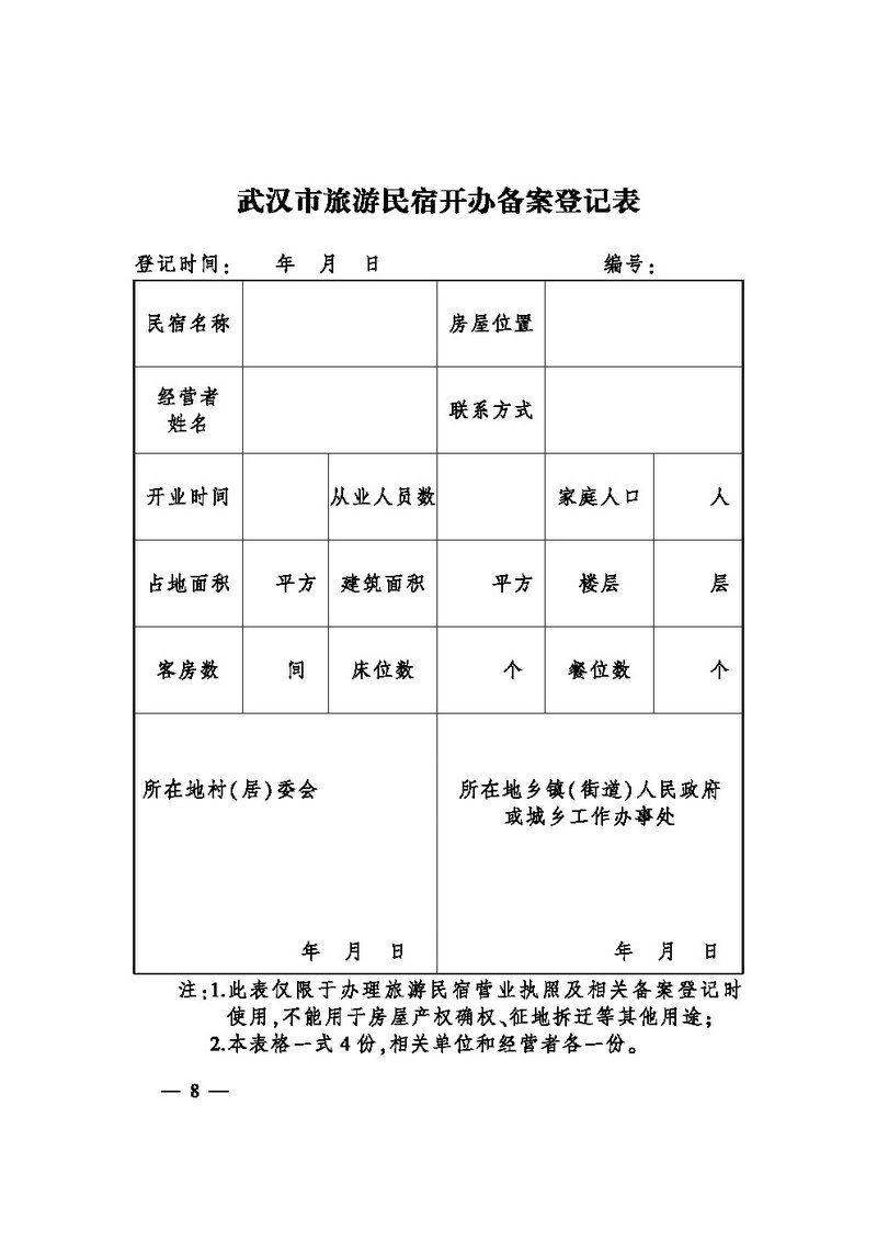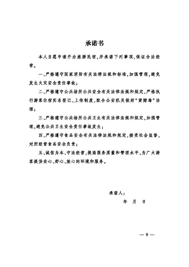 (一)明确监管职责和办证流程。由市、区市场监管部门负责受理旅游民宿工商营业执照申请,依法实施旅游民宿食品经营许可,公安、卫生健康等部门分别依法实施旅游民宿特种行业行政许可和公共卫生安全行政许可,街道(乡镇)为本辖区内旅游民宿申报初审和日常综合监管的责任单位。按照“先照后证”管理办法,旅游民宿经营业主应当先向所在地街道(乡镇)提出申办经营申请,填写《武汉市旅游民宿开办备案登记表》和《承诺书》(式样附后),初审合格后到所在区行政审批部门办理经营范围含有“旅游民宿”的营业执照,并经区公安、卫生健康、市场监管等部门行政许可后,方能投入正常运营。各区、各相关部门都要按照“马上办、网上办、一次办、就近办”的要求,进一步明确旅游民宿监管和办证的具体要求、标准、流程等。(责任单位:市市场监管局、公安局,市卫生健康委,各区人民政府〈含开发区、风景区管委会,下同〉)