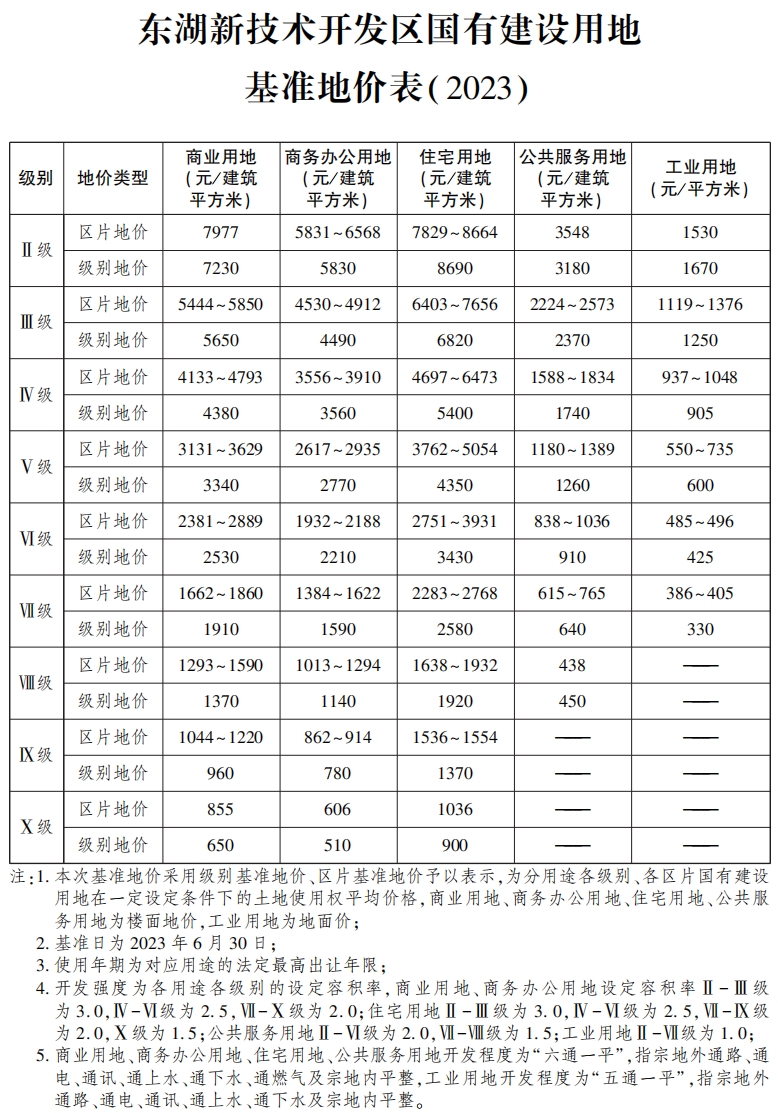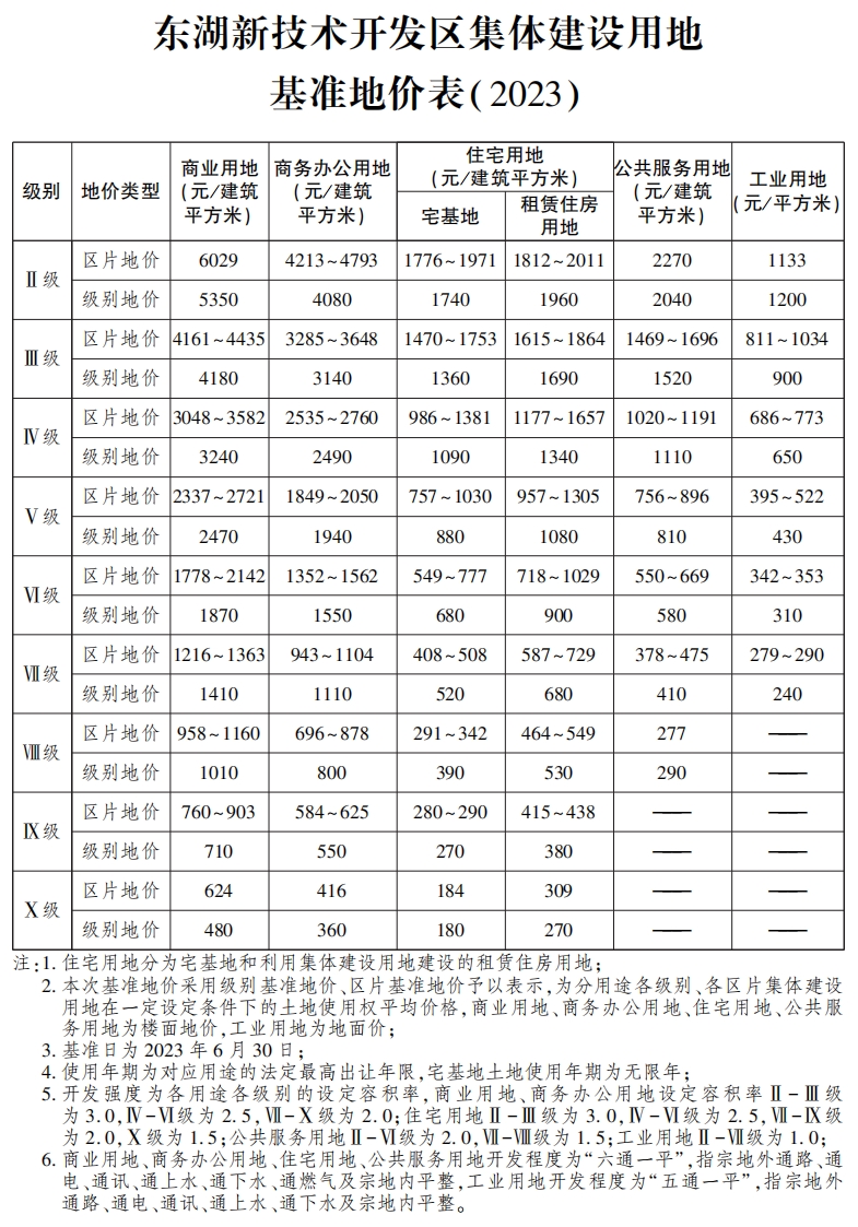 三、本通知公布的上述基准地价标准自2024年11月29日起执行。《东湖新技术开发区城乡建设用地基准地价图(2023)》由东湖高新区管委会发布。