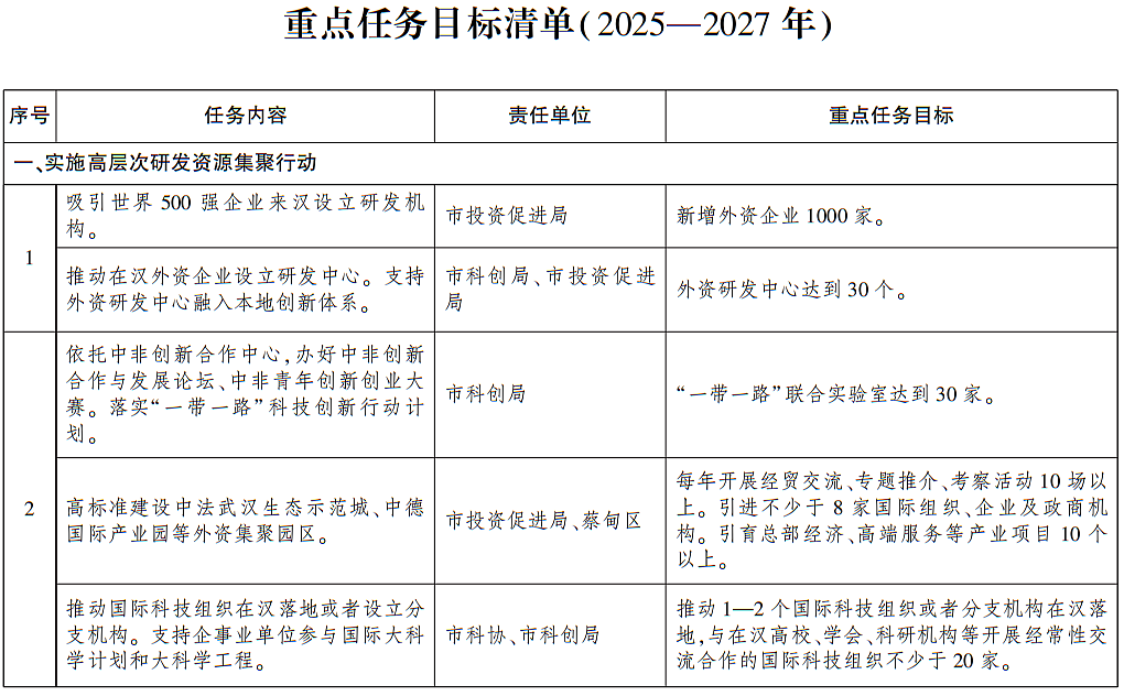 1.引聚国际研发机构。吸引世界500强企业来汉设立研发机构,导入国际技术、人才、资金等创新资源。推动在汉外资企业设立研发中心,联合高校院所、境外研发机构等创新主体开展技术攻关、共建创新平台、共育研发人才。支持外资研发中心融入本地创新体系,承担国际合作、重点研发等科技计划项目。到2027年,新增外资企业1000家,外资研发中心达到30个。
